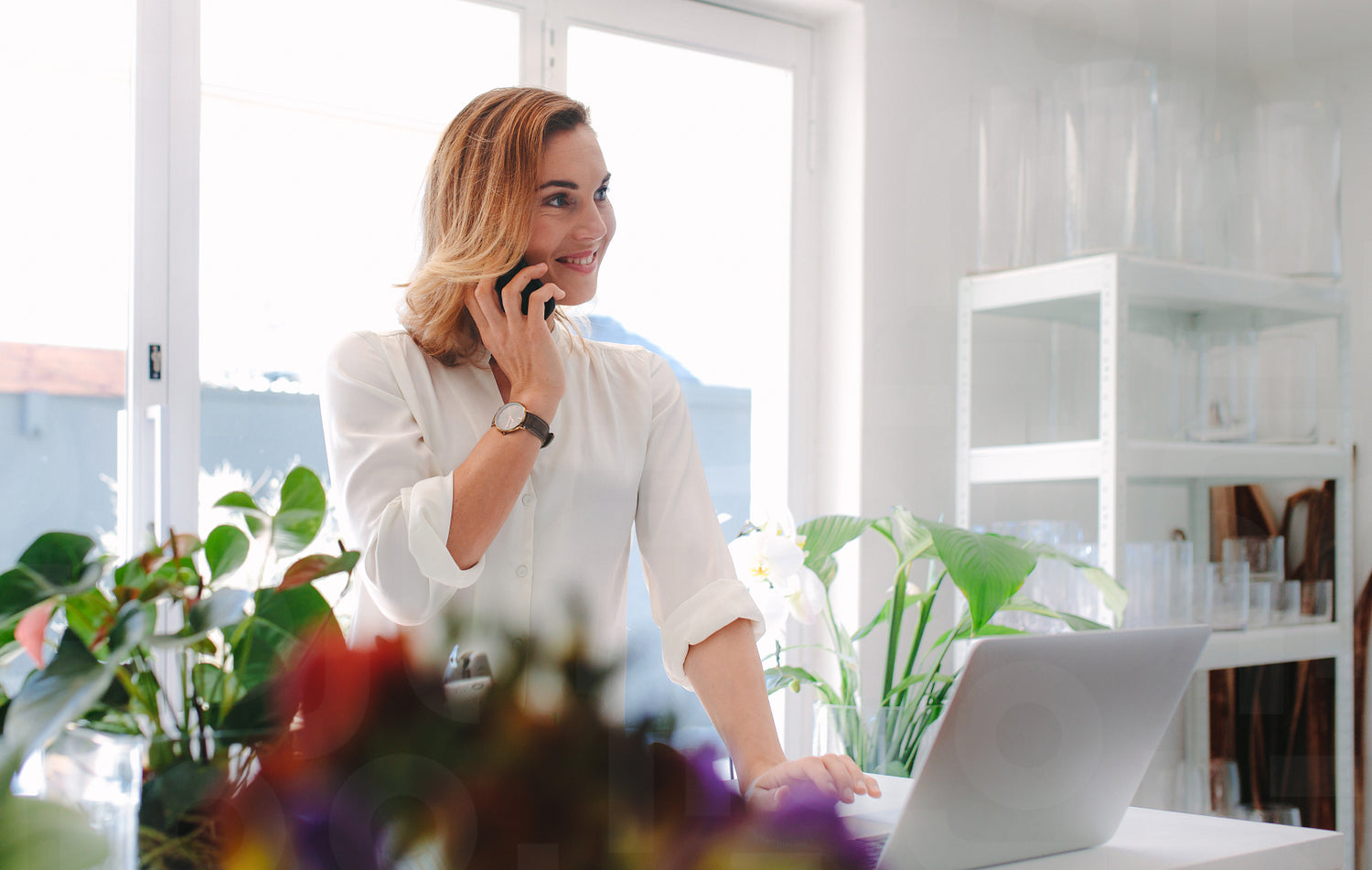 Female florist using mobile phone at her flower shop. Woman flower shop owner talking on cellphone.