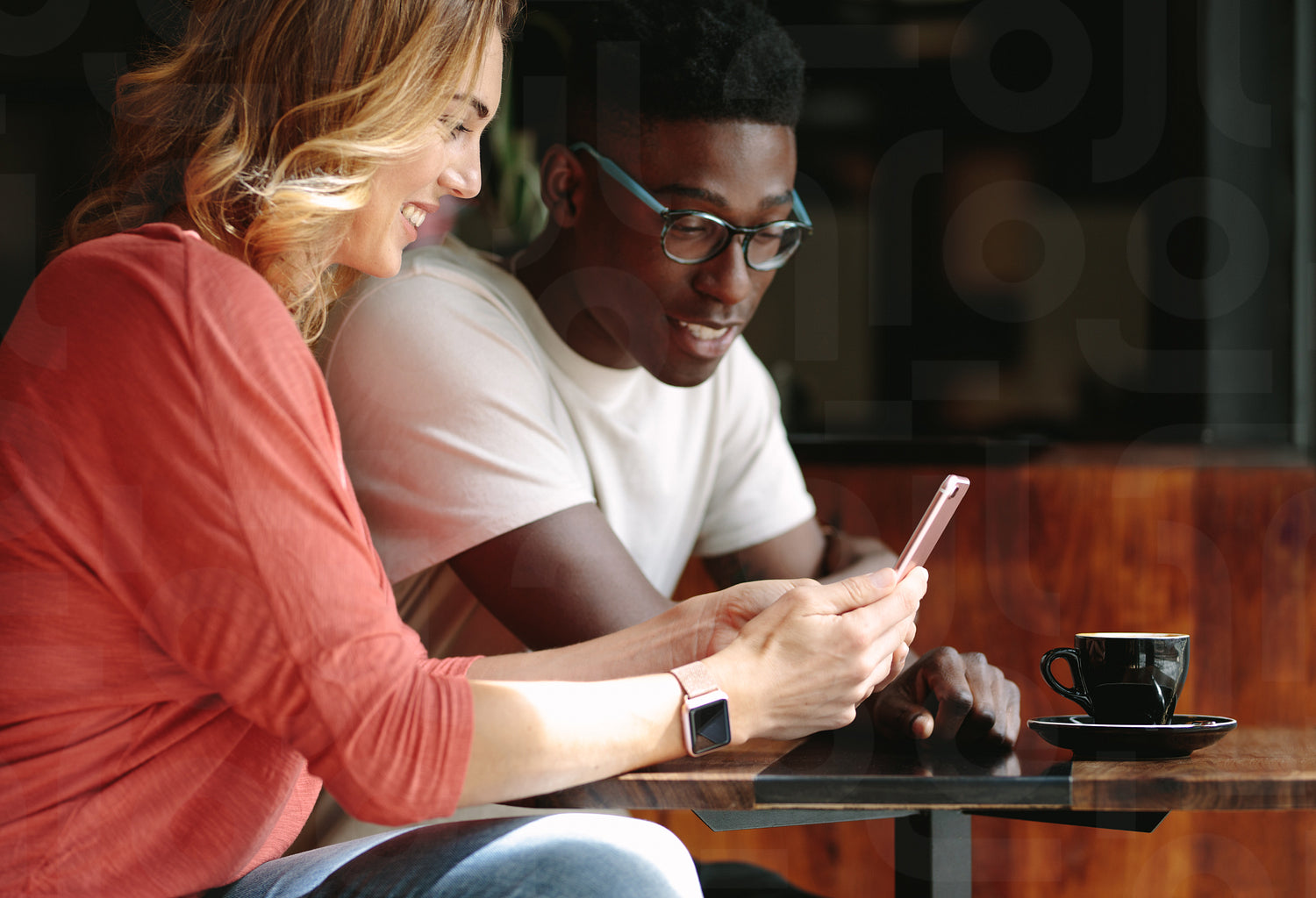 Couple sitting at a coffee shop using mobile phone. Man and woman sitting at a coffee table looking at a mobile phone.