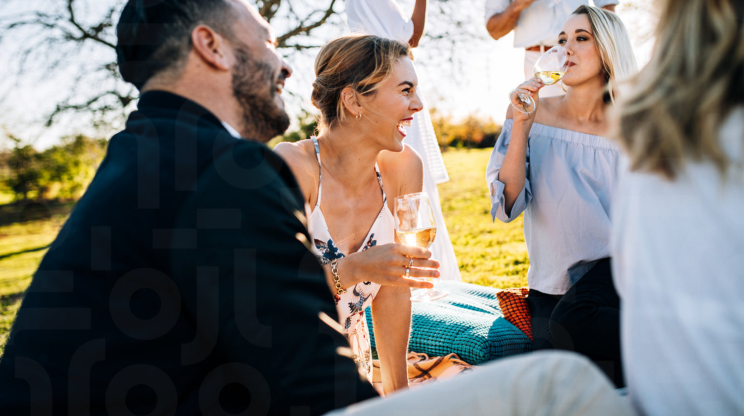Great time with friends. Young cheerful people chatting and drinking wine while sitting in garden restaurant.