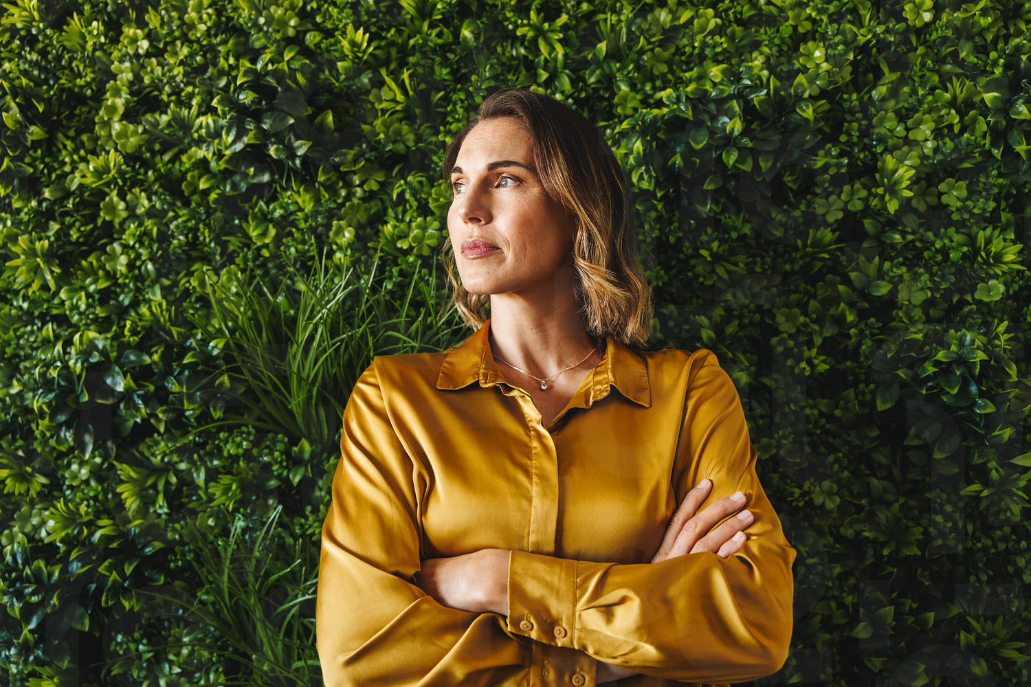 Successful business woman reflecting strategies for her green company, with a focus on sustainability and environmental responsibility. Professional woman committing to eco-friendly business goals.