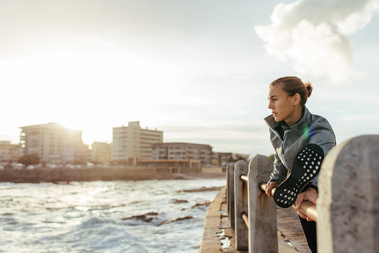 Healthy young woman stretching her legs on railing at seaside road. Fitness female warning up on the road by the sea.