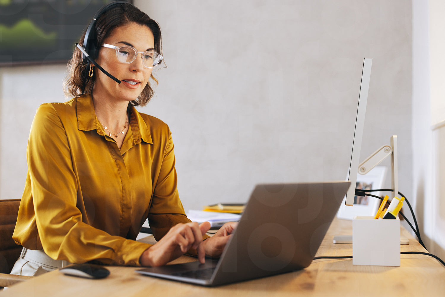 Phone call operator, wearing a headset and using a laptop, offers travel consulting services and virtual assistance. Woman using online resources to assist customers with travel plans and bookings.