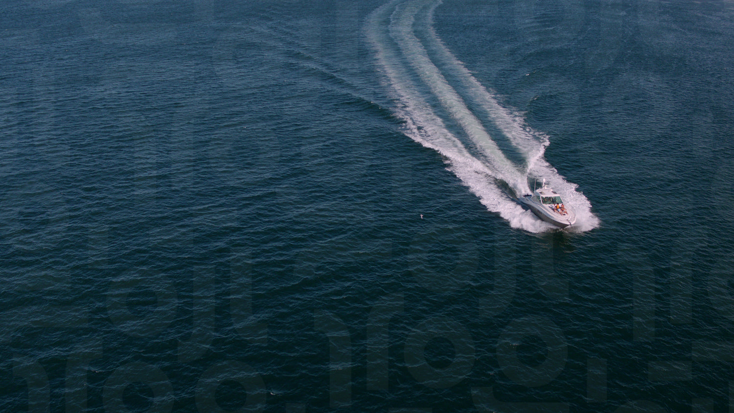 View from drone of private yacht sailing in sea with people on deck. Group of friends on a yacht deck.