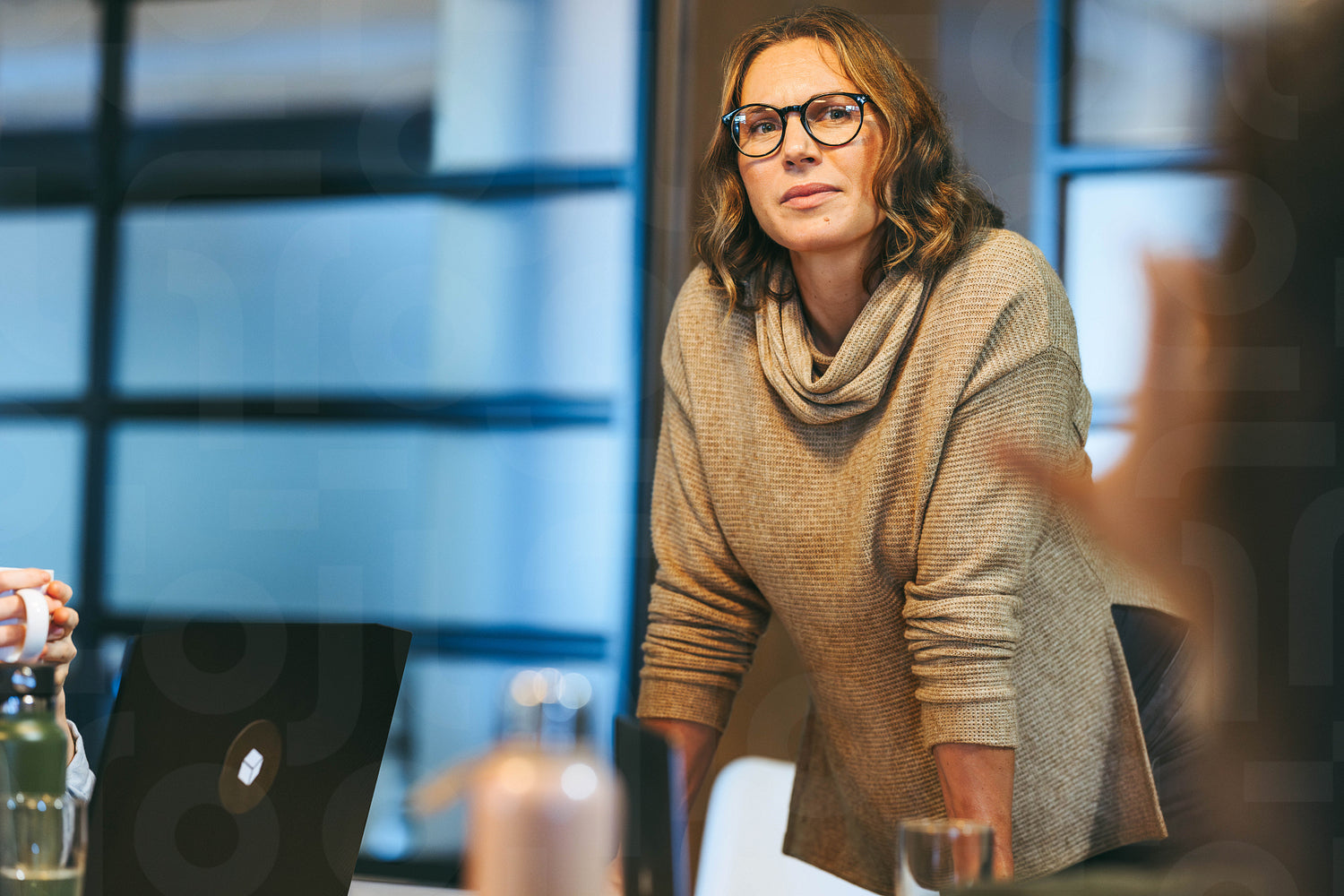 Businesswoman addresses colleagues in a boardroom. They engage in a creative discussion, promoting collaboration and teamwork. The mature leader fosters a tech-centric, startup atmosphere.