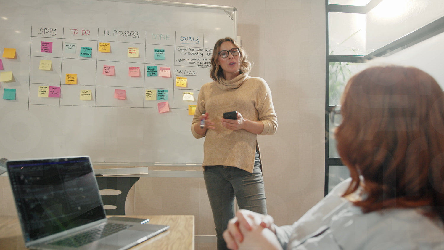 Scrum master having a discussion with her team in a meeting. Creative business women brainstorming in an office. Project management using a scrum framework.