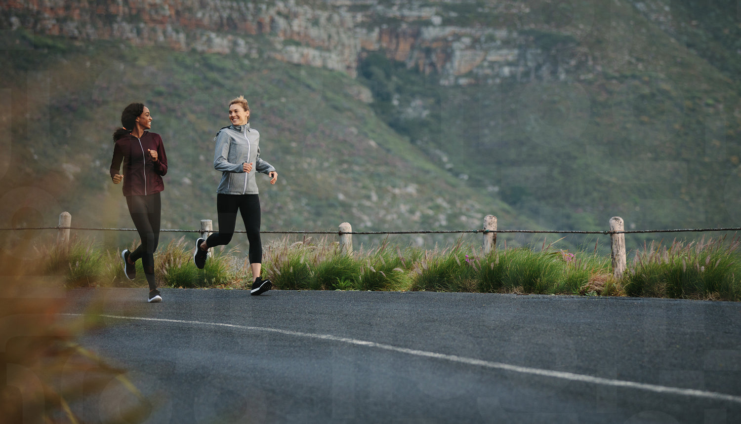 Two women going for an early morning run. Fitness runners in track suits running on road.