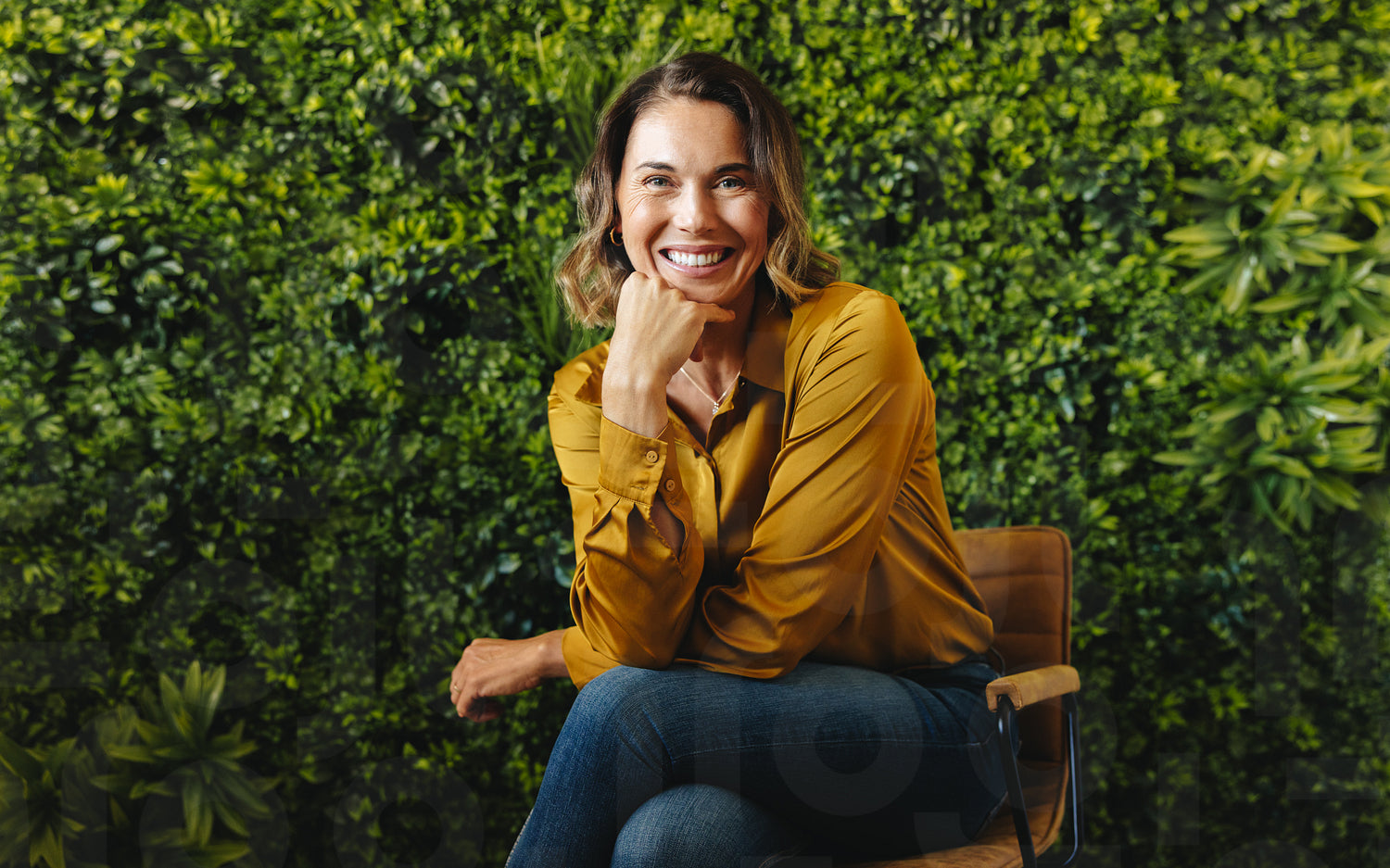 Businesswoman sitting in an office, celebrating achieving success in sustainable entrepreneurship. Professional Caucasian woman embracing eco-friendly business practices in her company.