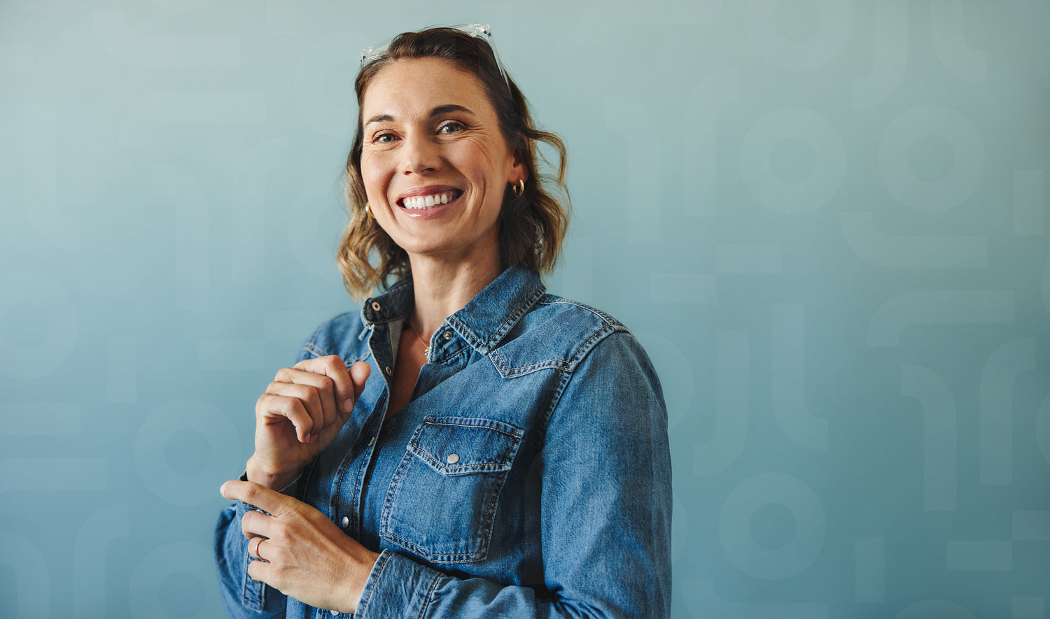 Woman representing the face of success as she stands in a professional studio. Dressed in business casual with a denim jacket, this happy and smiling entrepreneur is a true representation of a hardworking business person.