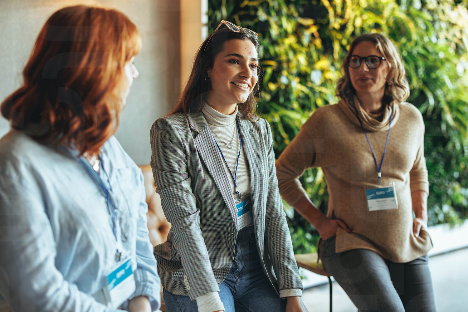 Three business women engage in a productive office panel discussion. They sit together, smiling and talking, showcasing teamwork and a positive work environment. This meeting exemplifies the dynamics of networking and collaboration in a professional setting.
