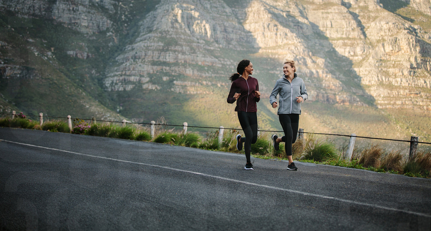 Women running on road early in the morning with hills in the background. Fitness women jogging on road.