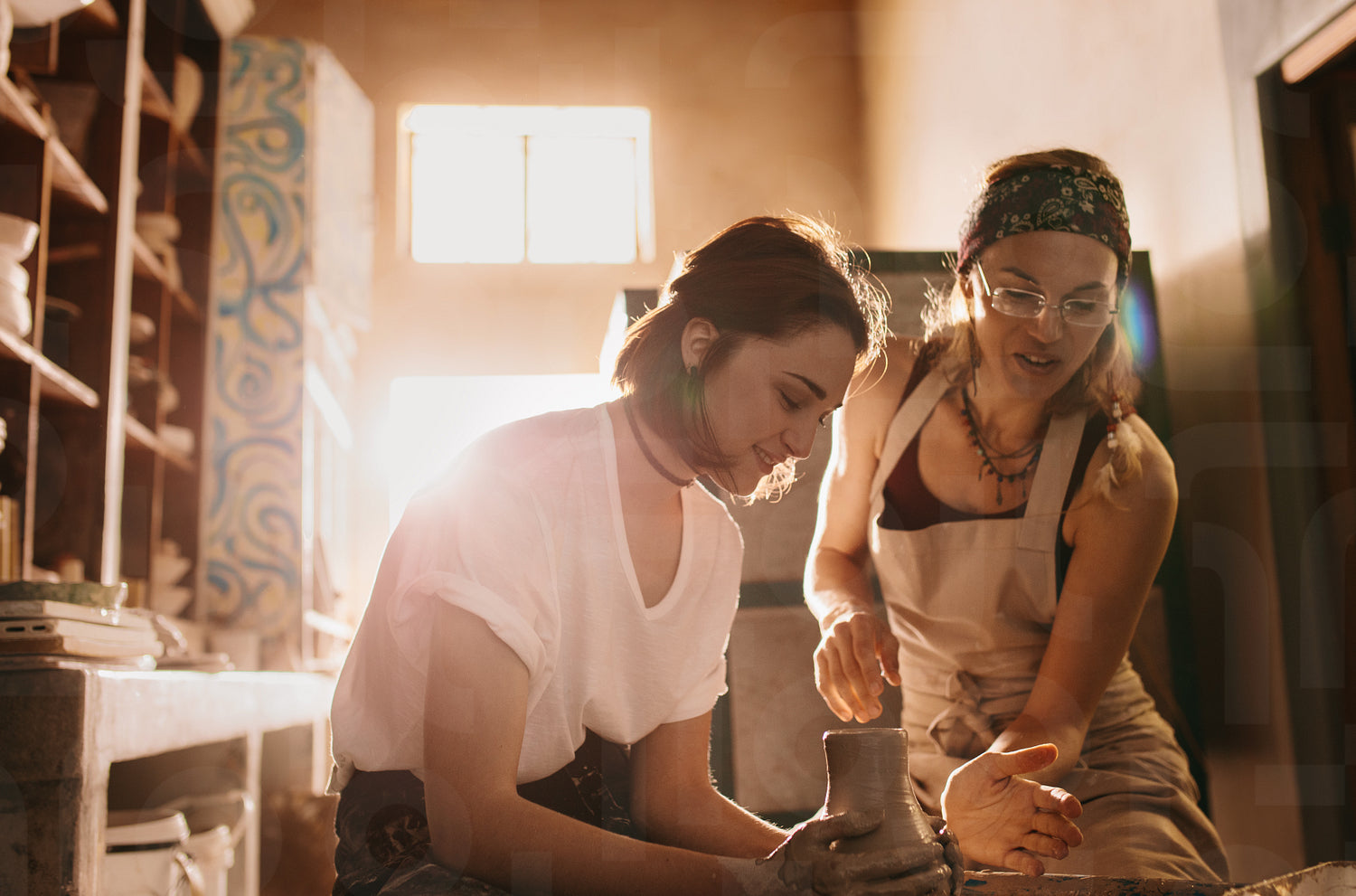 Female potter mentoring a woman in the craft of pottery. Young woman learning to mould clay on pottery wheel at workshop.