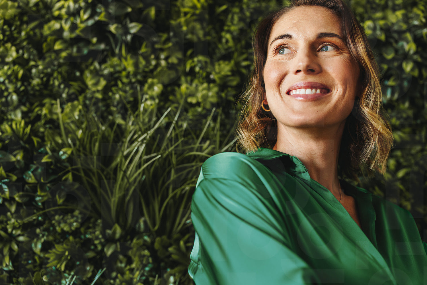 Woman smiling while contemplating creative ideas for launching an environmentally responsible business. Caucasian business professional standing in an office with a green interior design.
