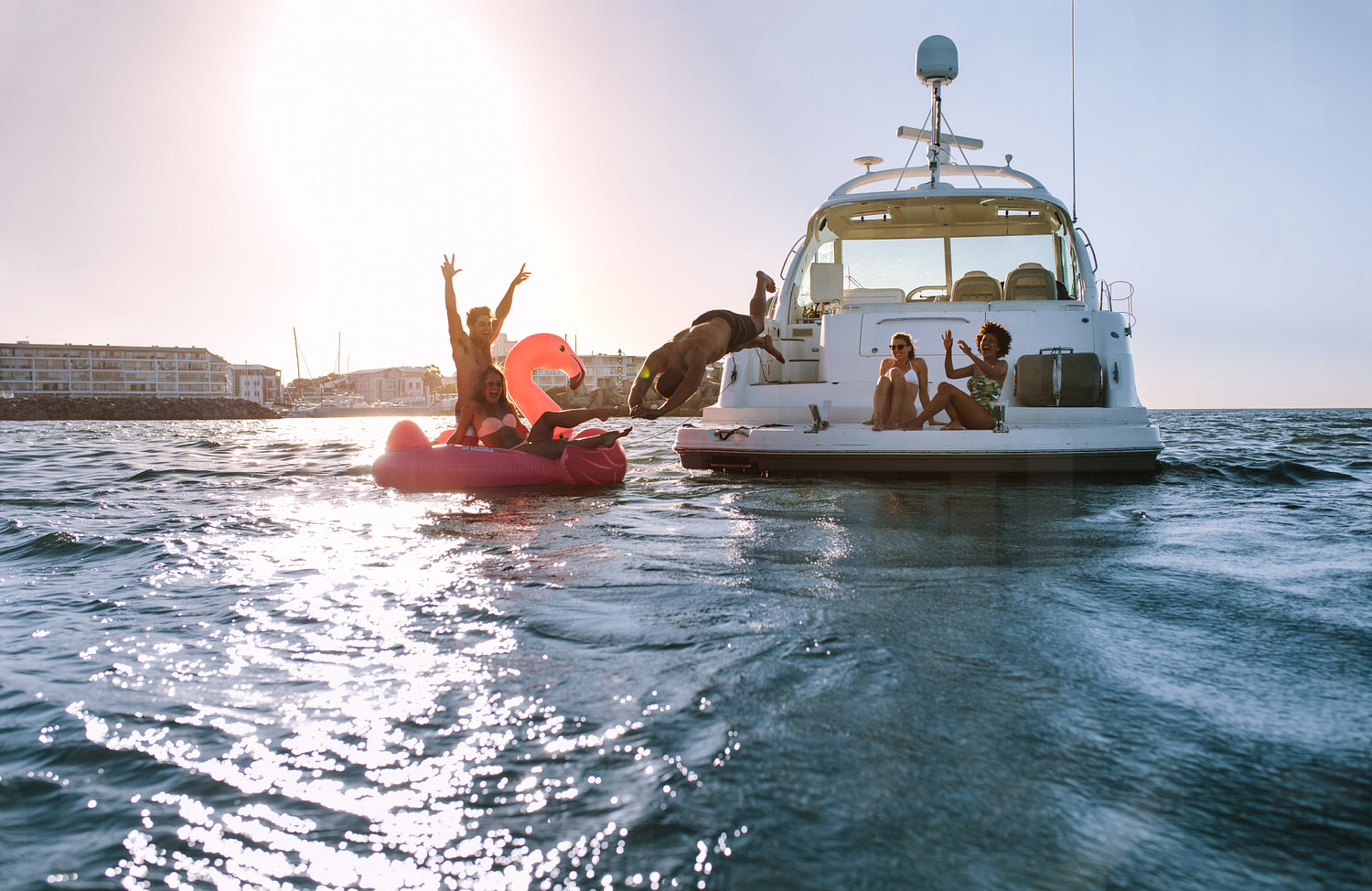 Group of friends enjoying a summer day on a inflatable toy and yacht. Young people having fun. Man diving in the sea with friends cheering from yacht and inflatable toy.