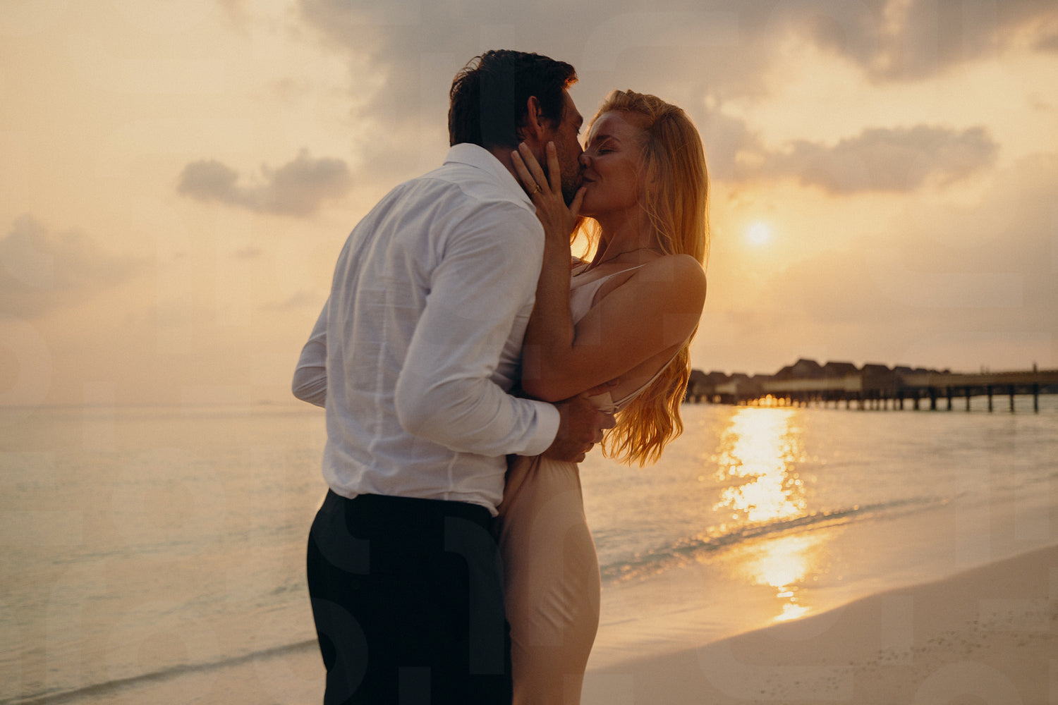 Dreamy honeymoon moment of a couple kissing on a beautiful beach at sunset