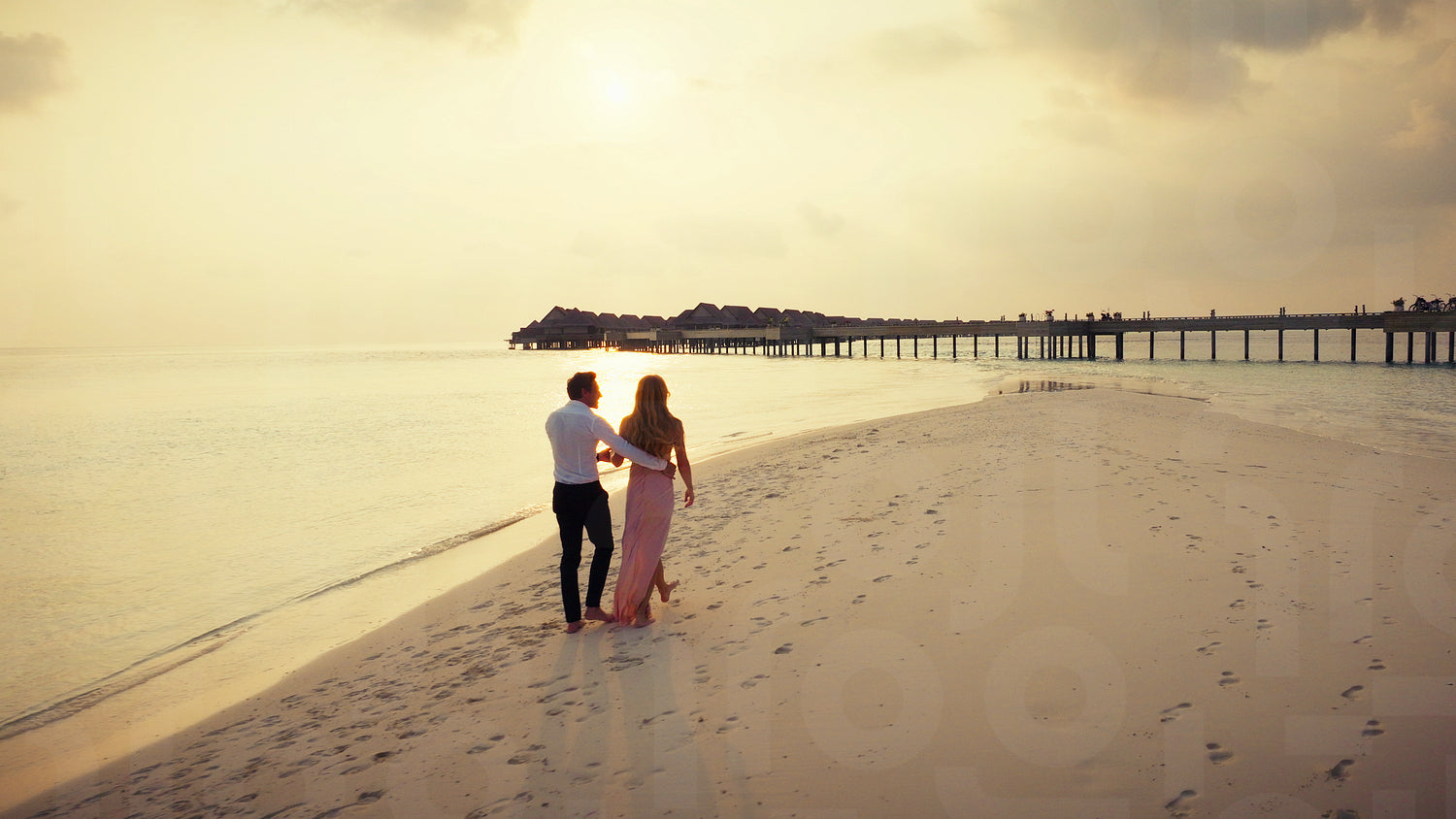 A romantic couple walks along a pristine sandy beach during a beautiful tropical sunset. They enjoy a luxurious and peaceful vacation at an exclusive island resort.