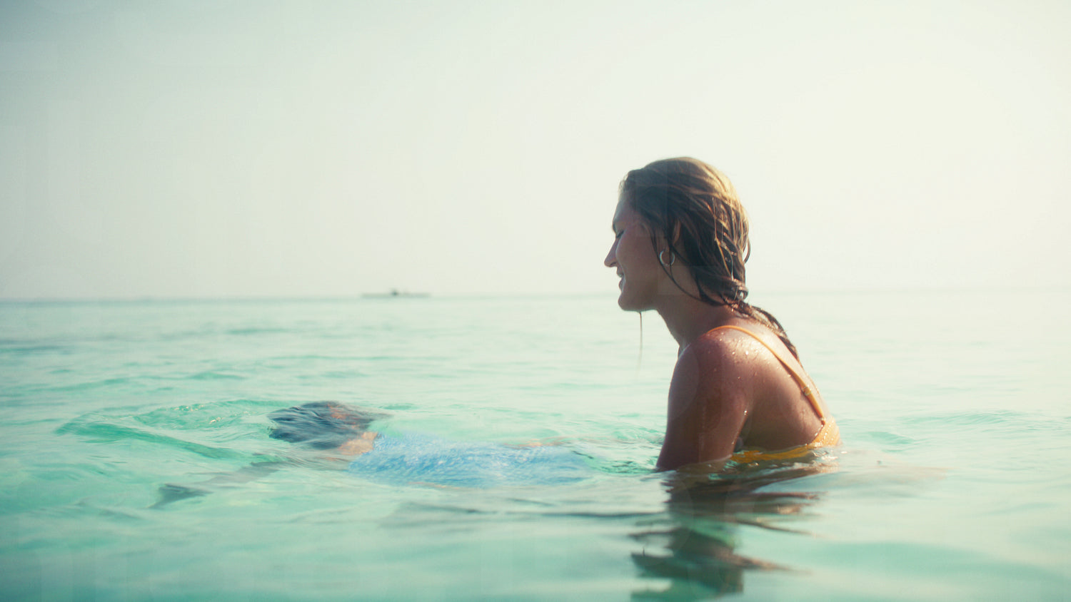 Happy mother and daughter sharing a joyful moment in calm ocean water on a tropical holiday. Emphasizes family bonding, carefree summer fun, and the magic of spending time together by the sea.