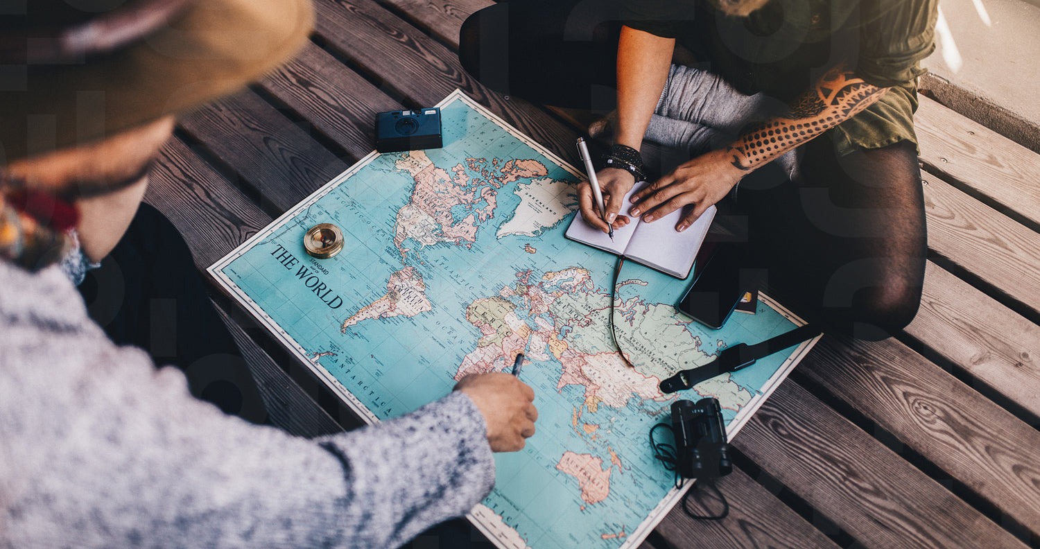 Man and woman planning tour using a world map. Woman making notes while the man is pointing at world map with travel accessories around.