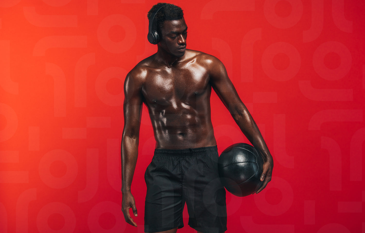 Shirtless man standing with medicine ball against red background. African american guy with muscular body holding a fitness ball and looking away.