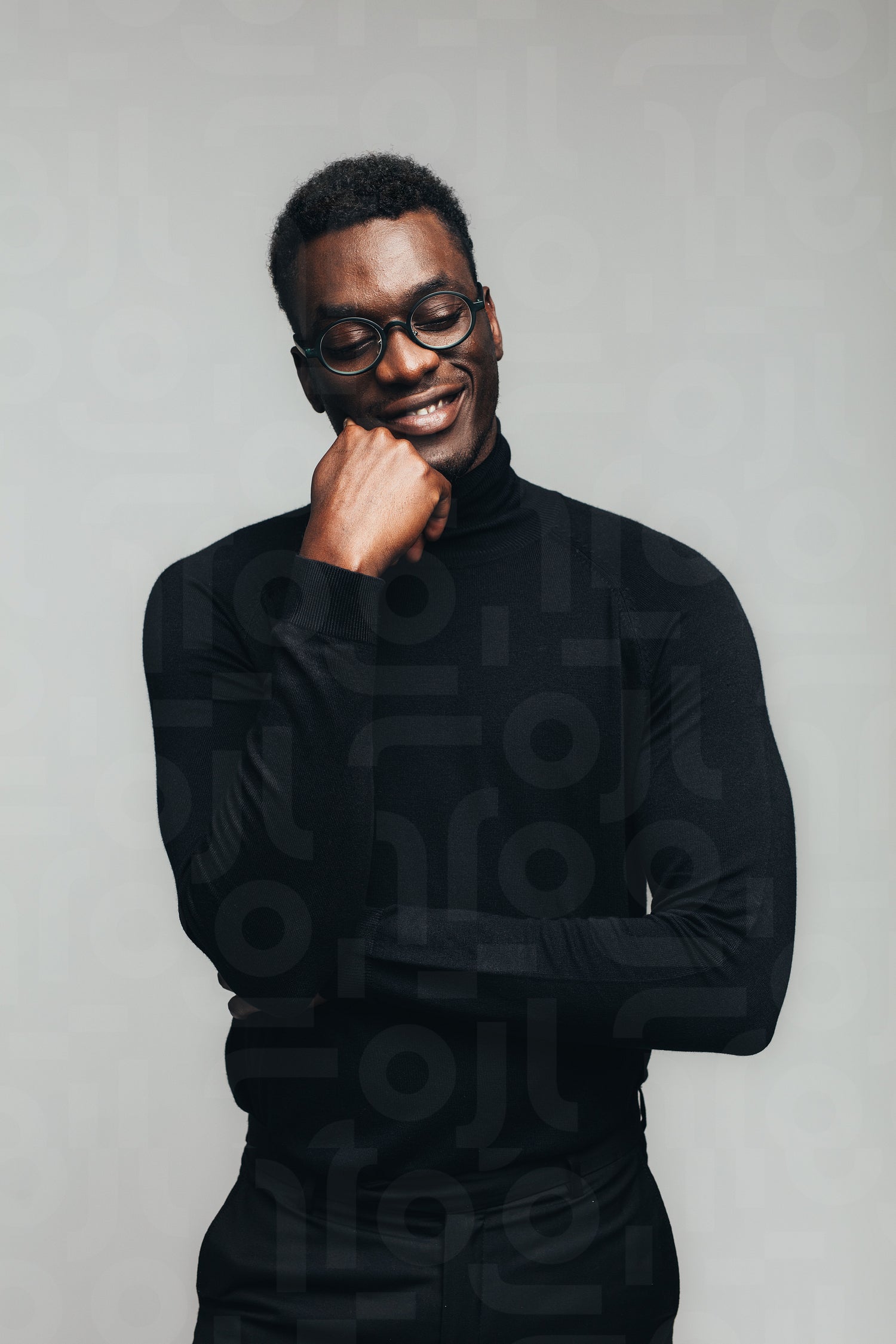Happy young african man smiling with eyes closed against gray background. Man in black casuals standing with a pleased smile.