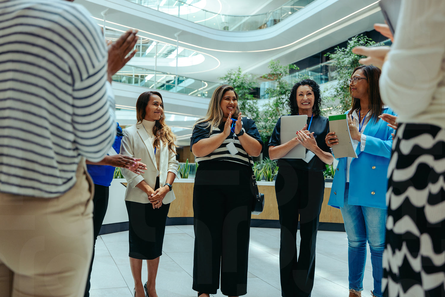 Professionals in a modern office applauding while holding notepads. The scene captures teamwork, collaboration, and success in a vibrant and inspiring workplace setting.