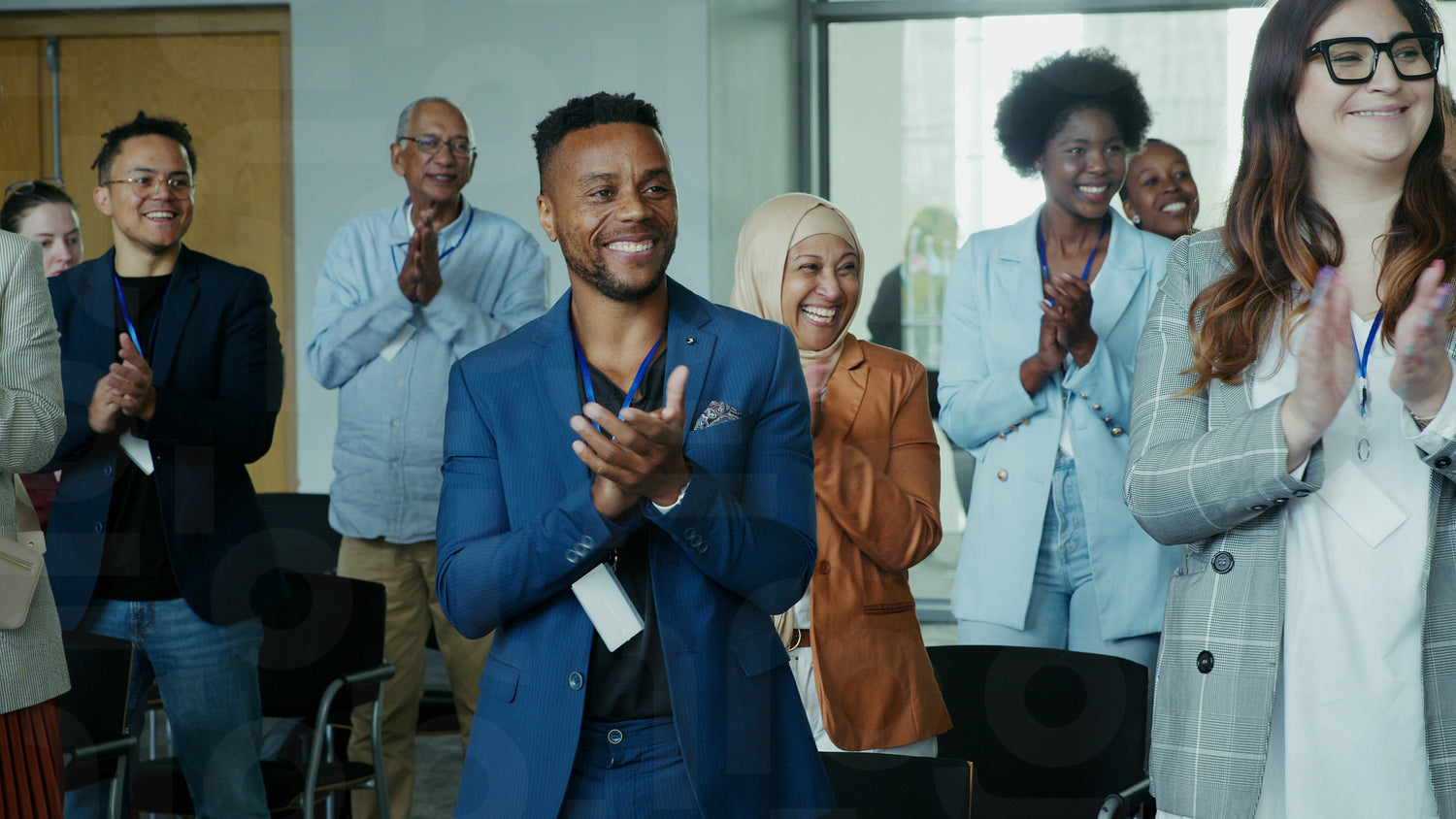 A diverse group of happy business professionals enthusiastically applauds during a conference or event. Their clapping signifies success, collaboration, and a positive atmosphere for networking.