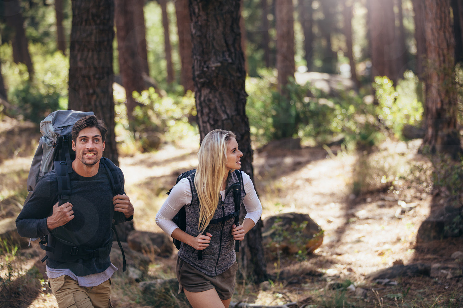 Man and woman hikers trekking in forest. Hiker couple exploring nature walking through the woods.