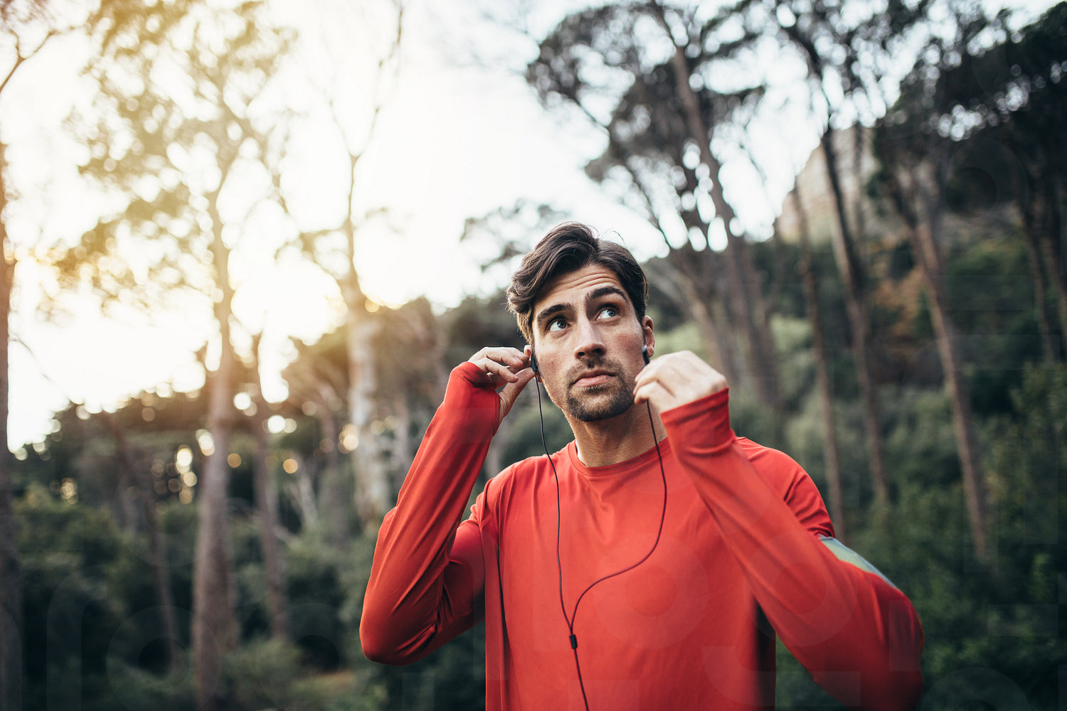 Man wearing earphones looking away. Runner listening to music during morning jog.