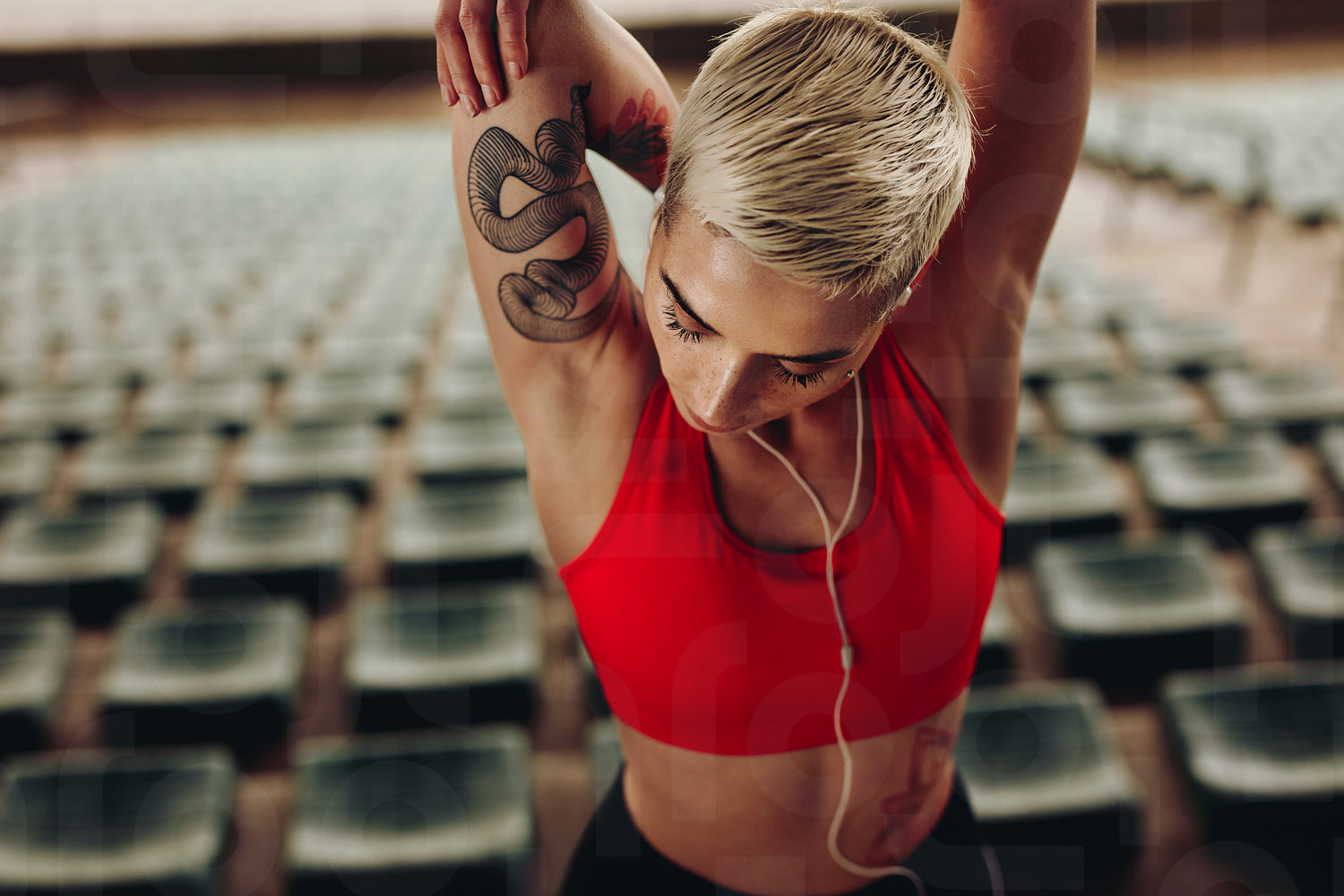 Fitness woman standing in a stadium stand and doing exercises. Woman doing warm up exercises in the stands while listening to music.