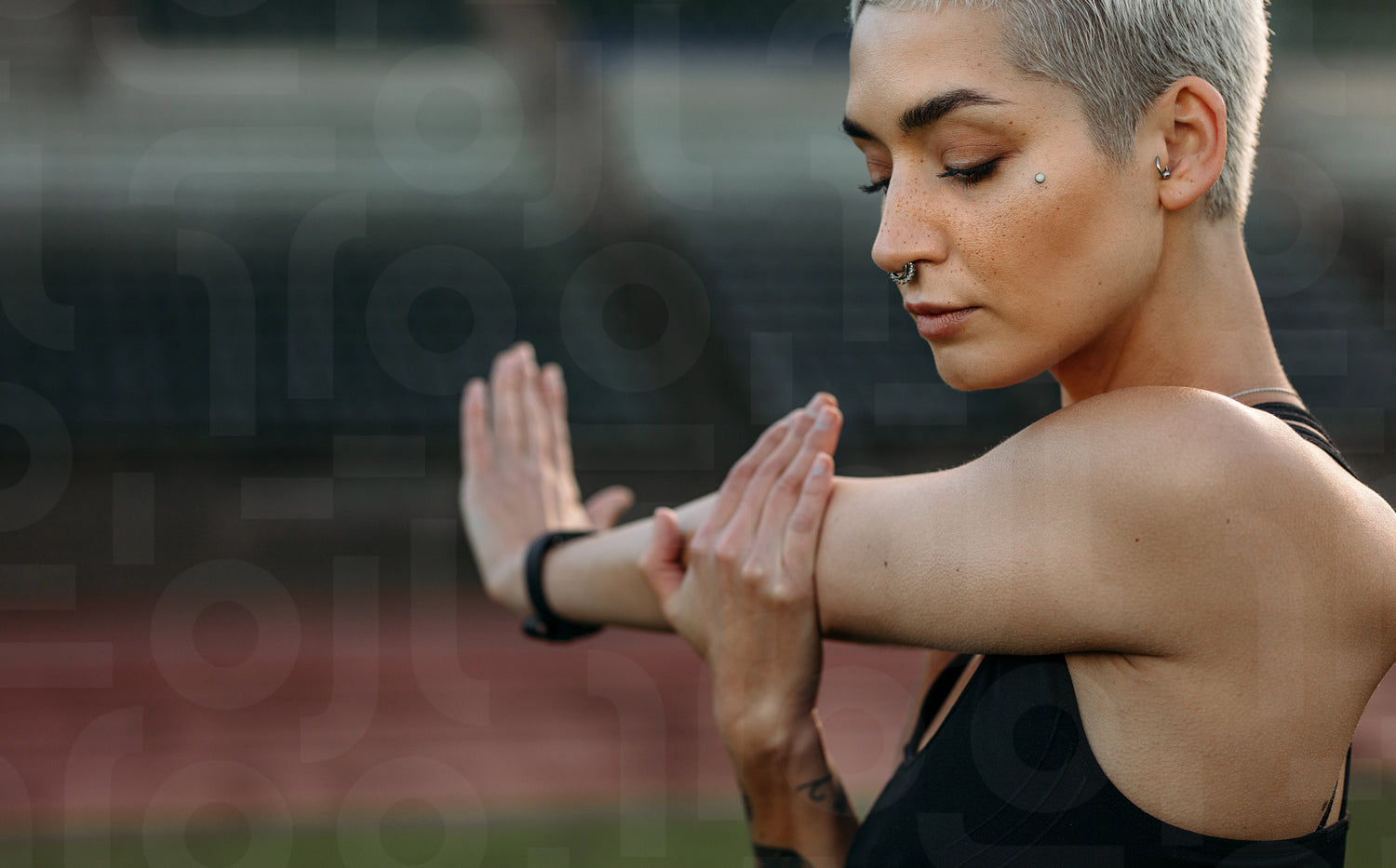 Side view of a female athlete stretching her arm standing in a ground. Close up of a woman athlete doing workout standing in a stadium.