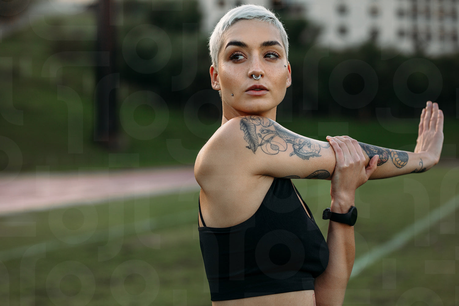 Woman athlete with tattoo on her arm doing stretching exercises in a ground. Portrait of a woman in fitness clothes doing warm up exercises.