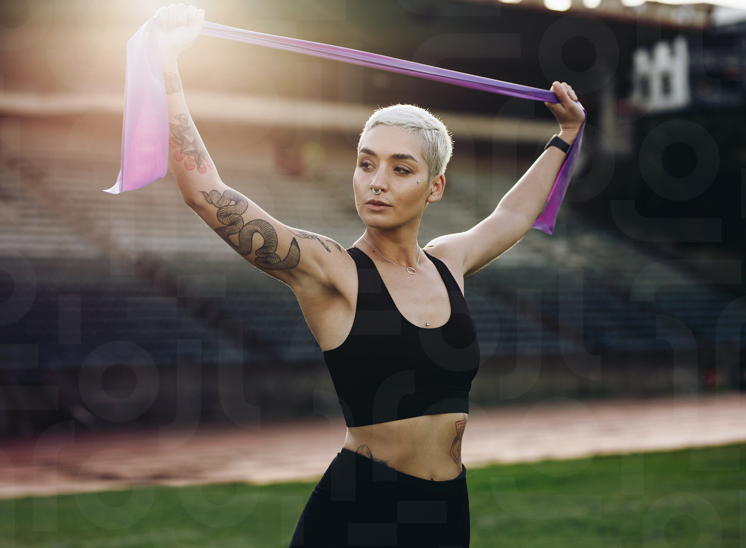 Woman runner standing in a track and field stadium doing stretching exercises holding a resistance band. Athletic woman in fitness clothes doing warm up exercises.