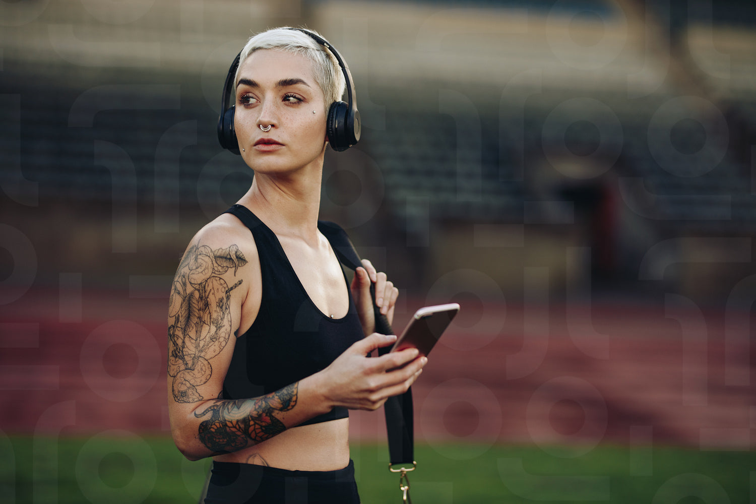Side view of a female runner standing inside a track and field stadium carrying her bag. Female athlete listening to music on wireless headphones holding mobile phone.