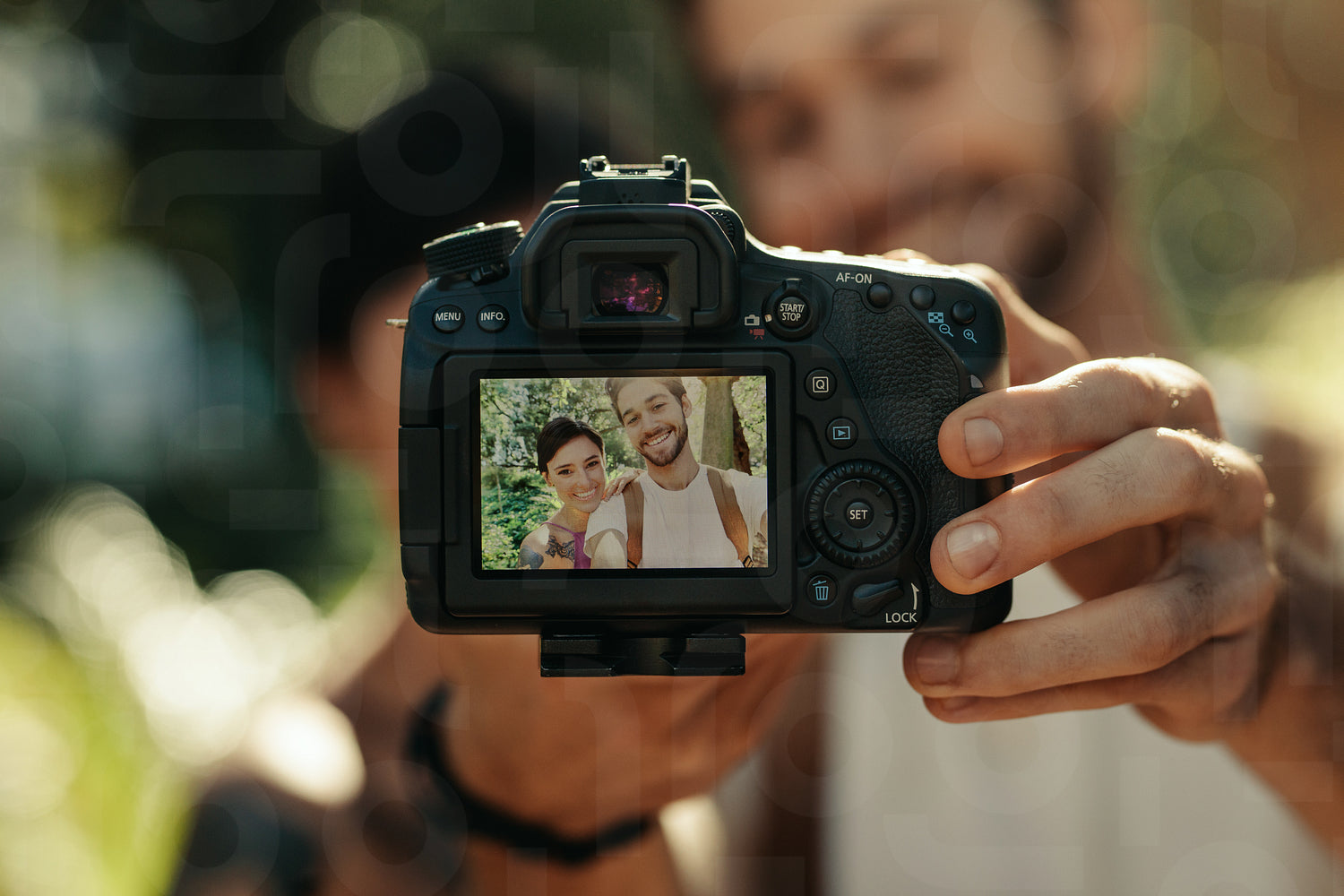 Close up of a camera screen showing a tourist couple taking selfie standing in a garden. Man holding a camera to shoot a selfie.