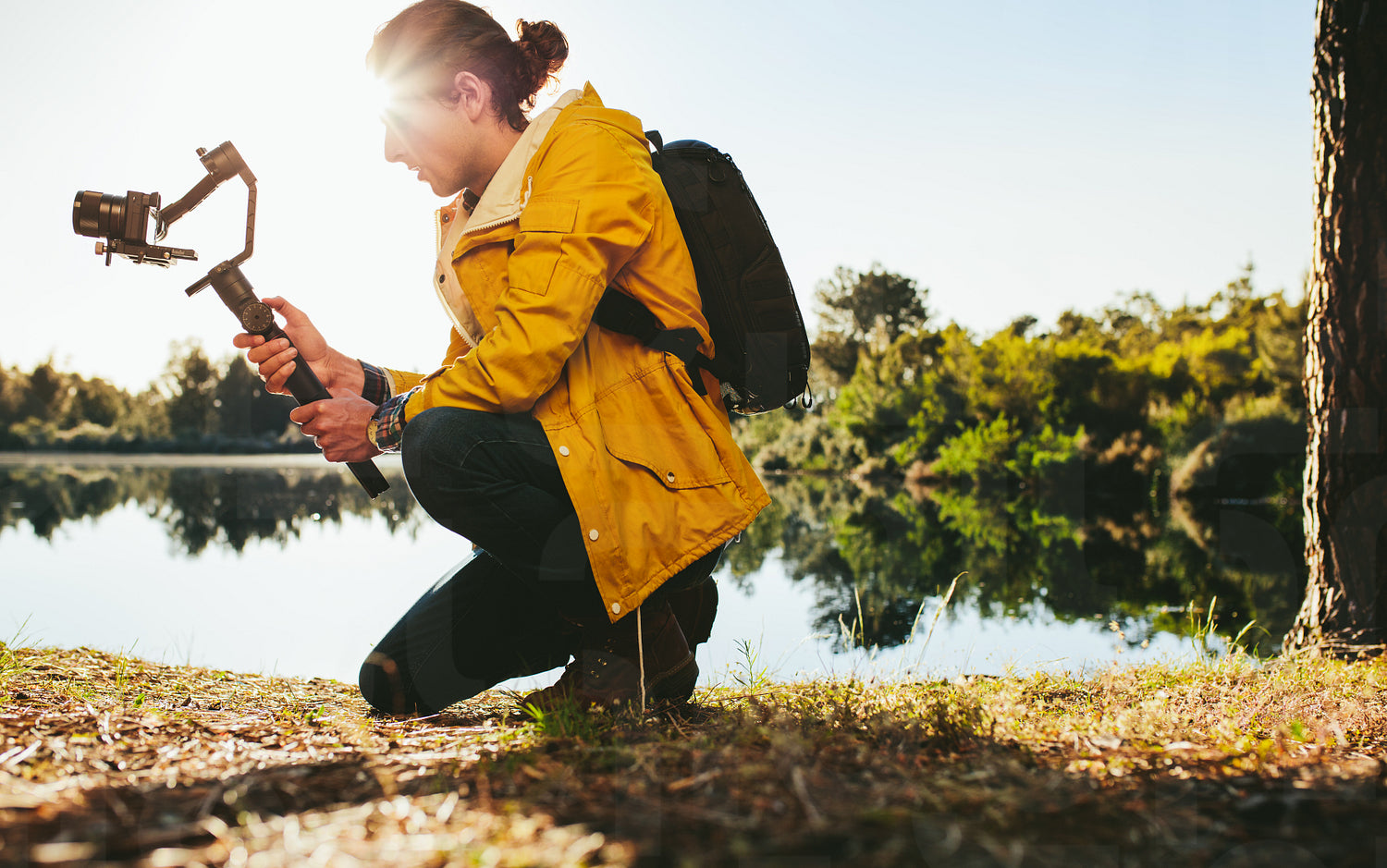 Man using advanced technology gadgets to shoot photos of nature. Traveler sitting beside a lake taking a photo on a dslr camera mounted on a hand held gyroscope gimbal.