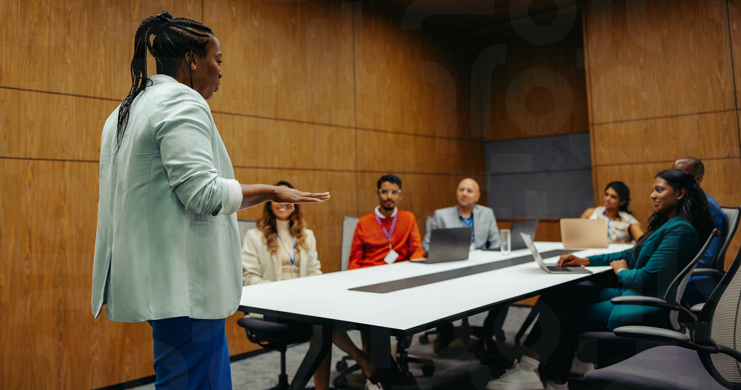 A diverse group of professionals engaged in a dynamic business meeting. A confident presenter leads the discussion, and the corporate setting reflects a professional atmosphere.