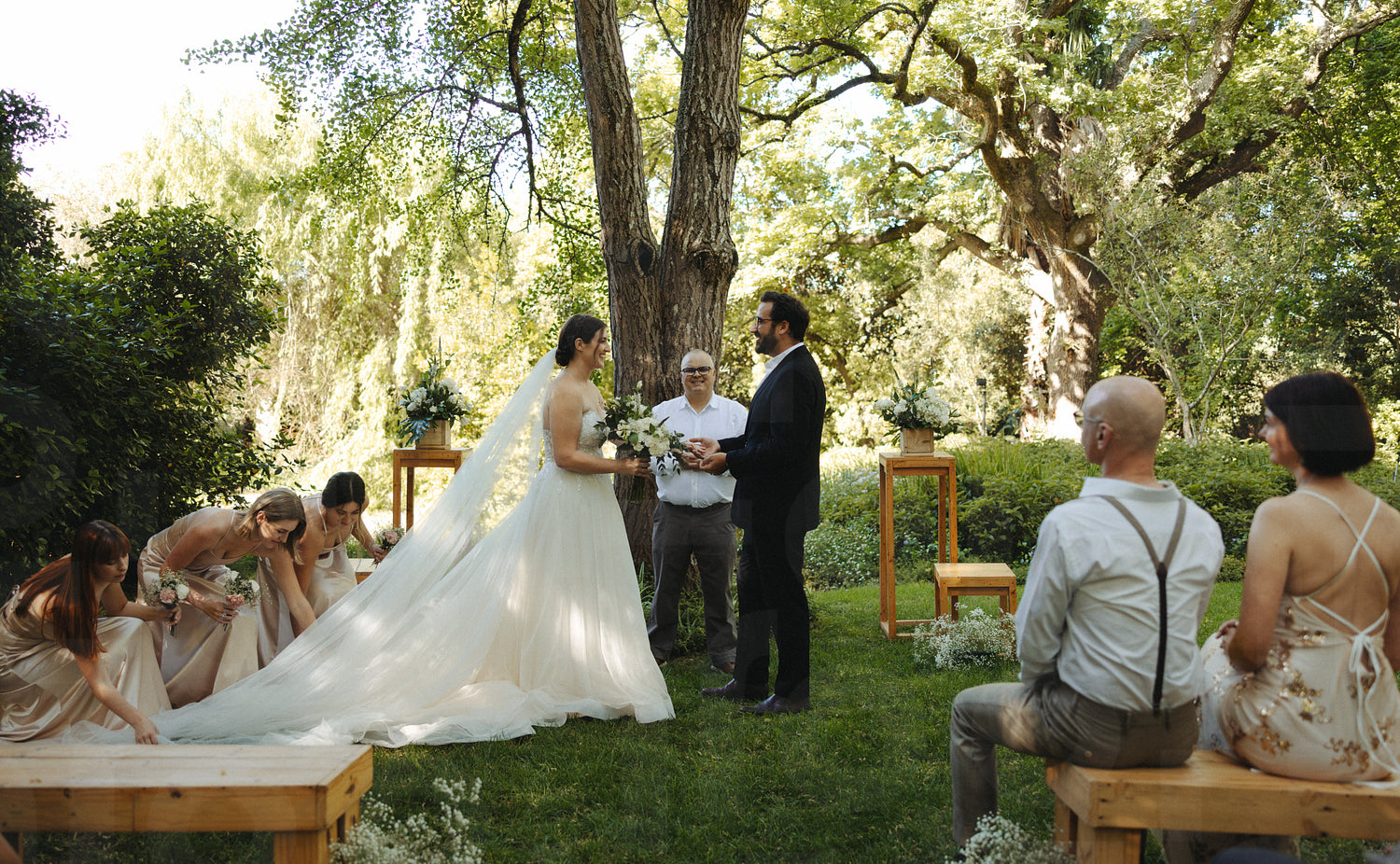 Outdoor wedding ceremony under trees with a couple exchanging vows