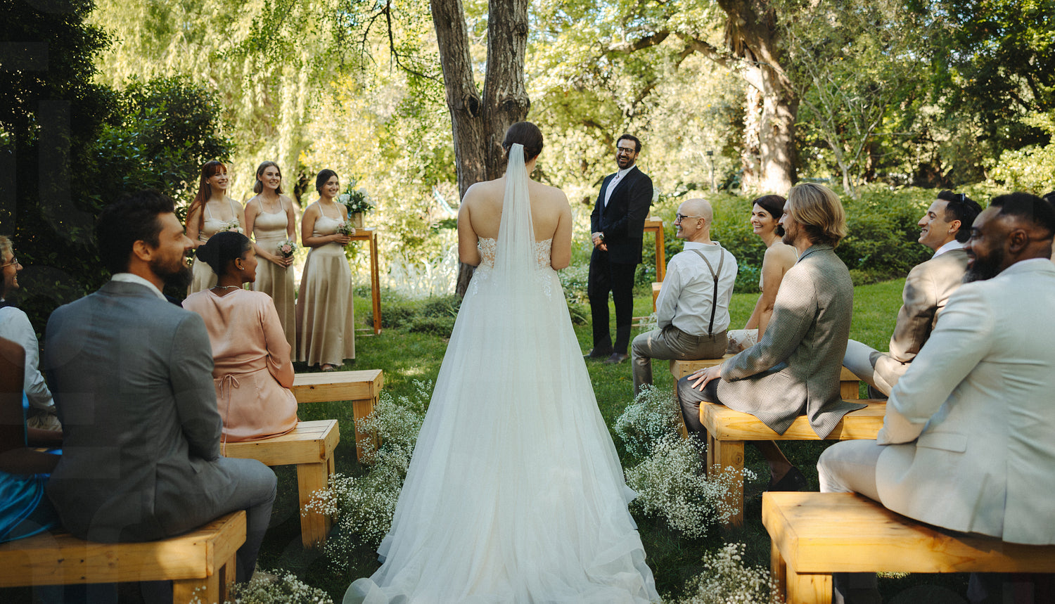 Outdoor wedding ceremony with bride, guests, and bridesmaids in lush garden setting