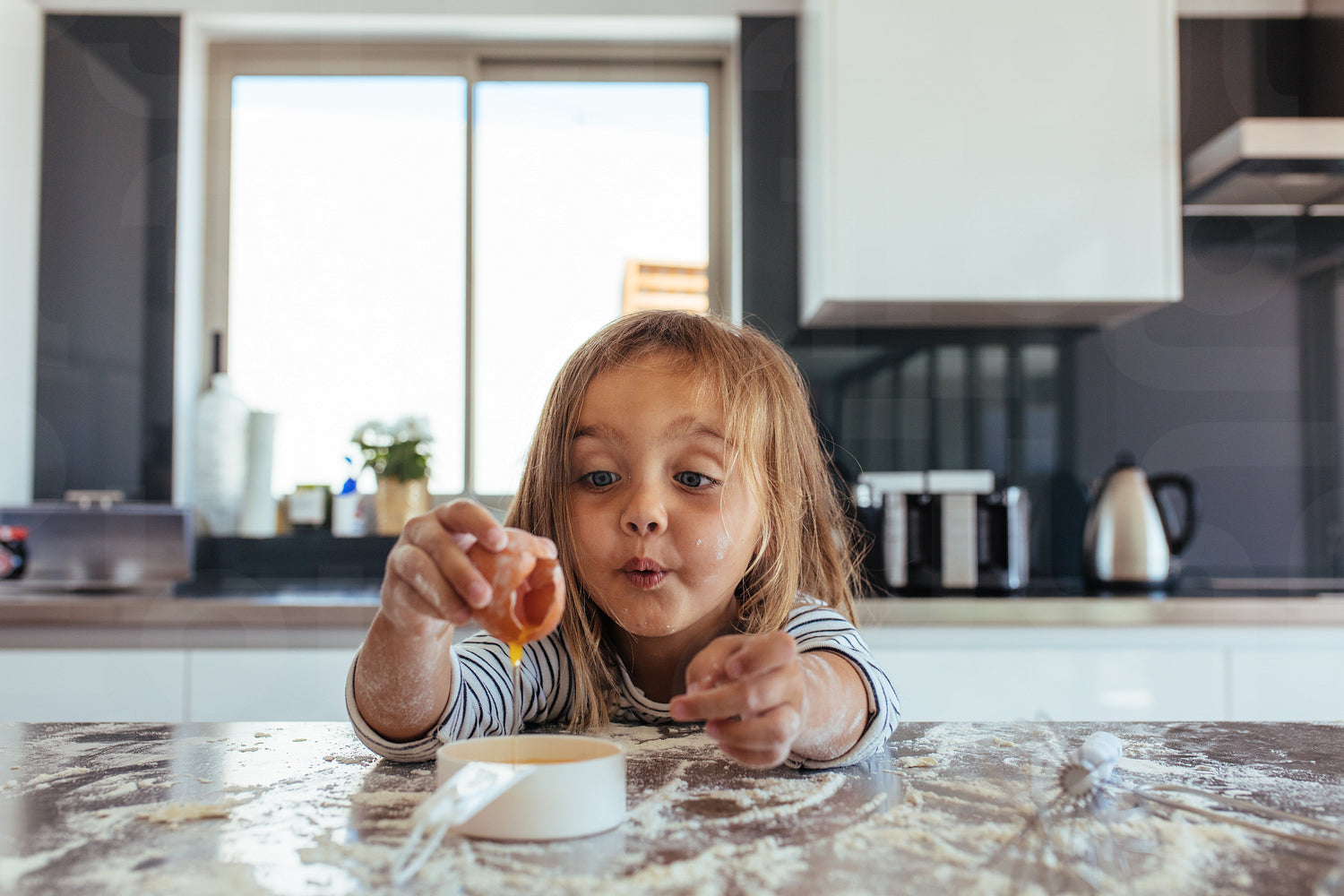 Cute little girl breaking an egg into a small pan over kitchen counter. Beautiful young girl baking in the kitchen.