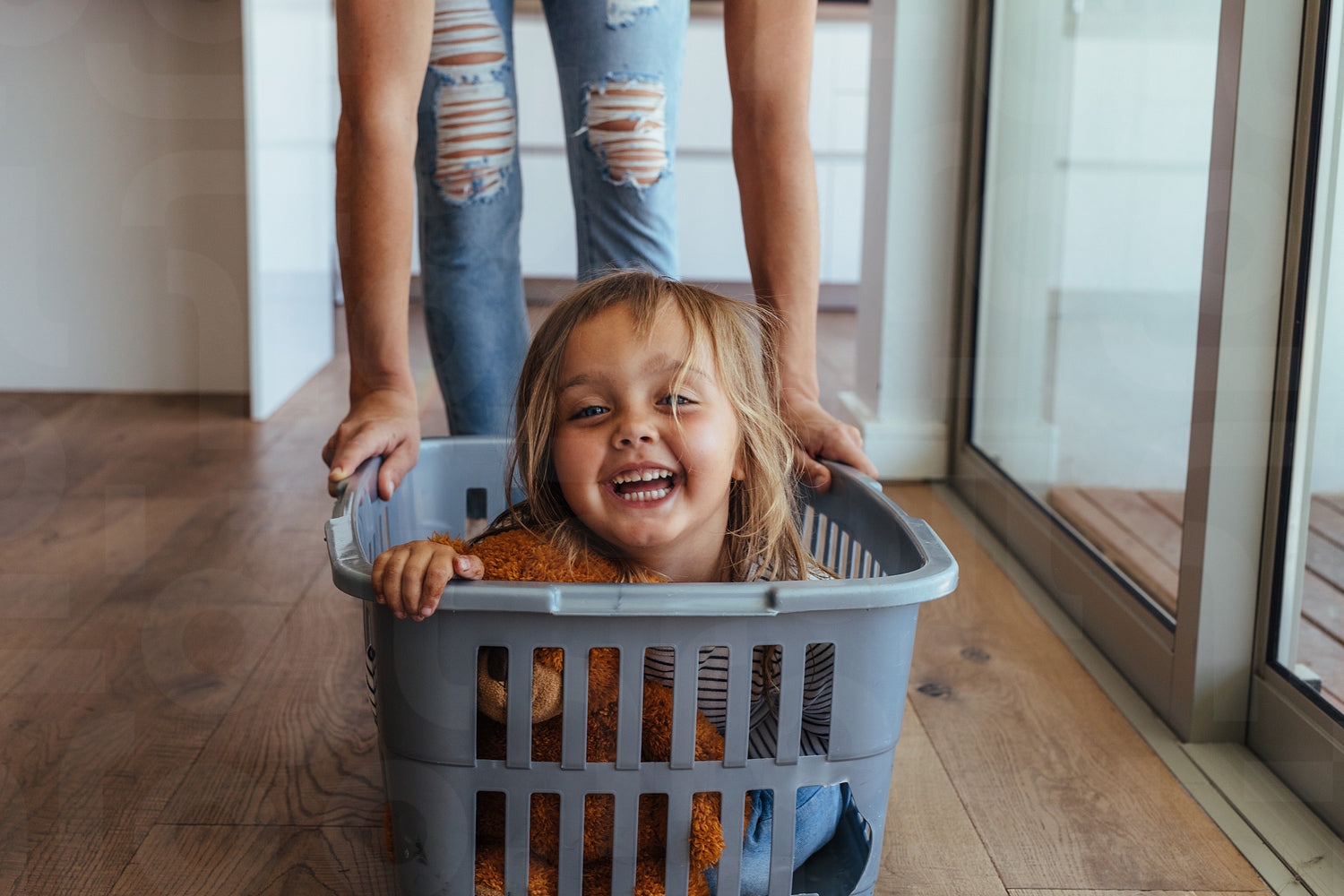 Beautiful little girl sitting in a washing basket being pushed by her mother. Cute little girl and her mother playing while doing laundry at home.