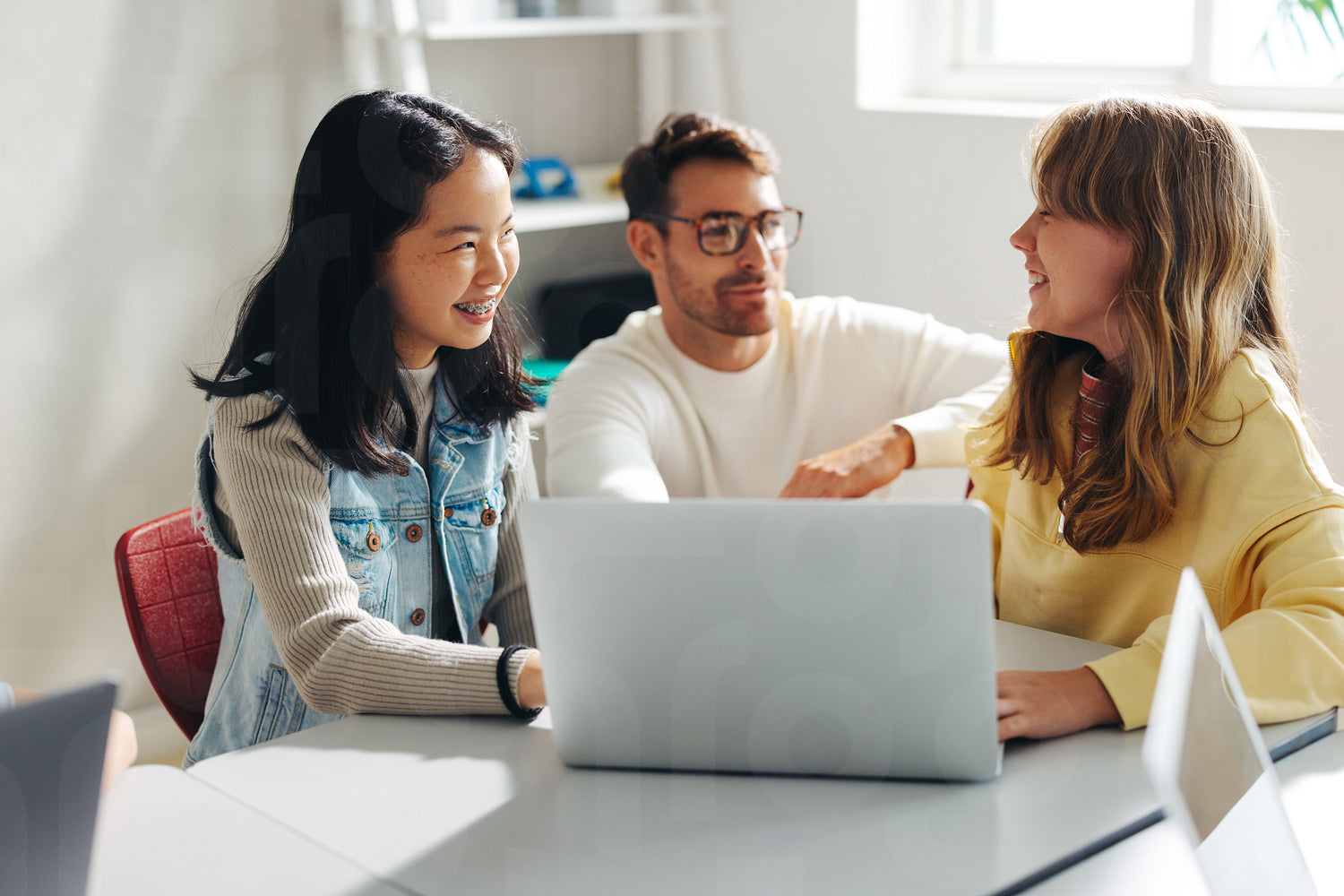 Tutor helping young female students with a computer science lesson in a classroom. Two young girls smiling and engaging with their teacher as they learn coding and digital education with a laptop.