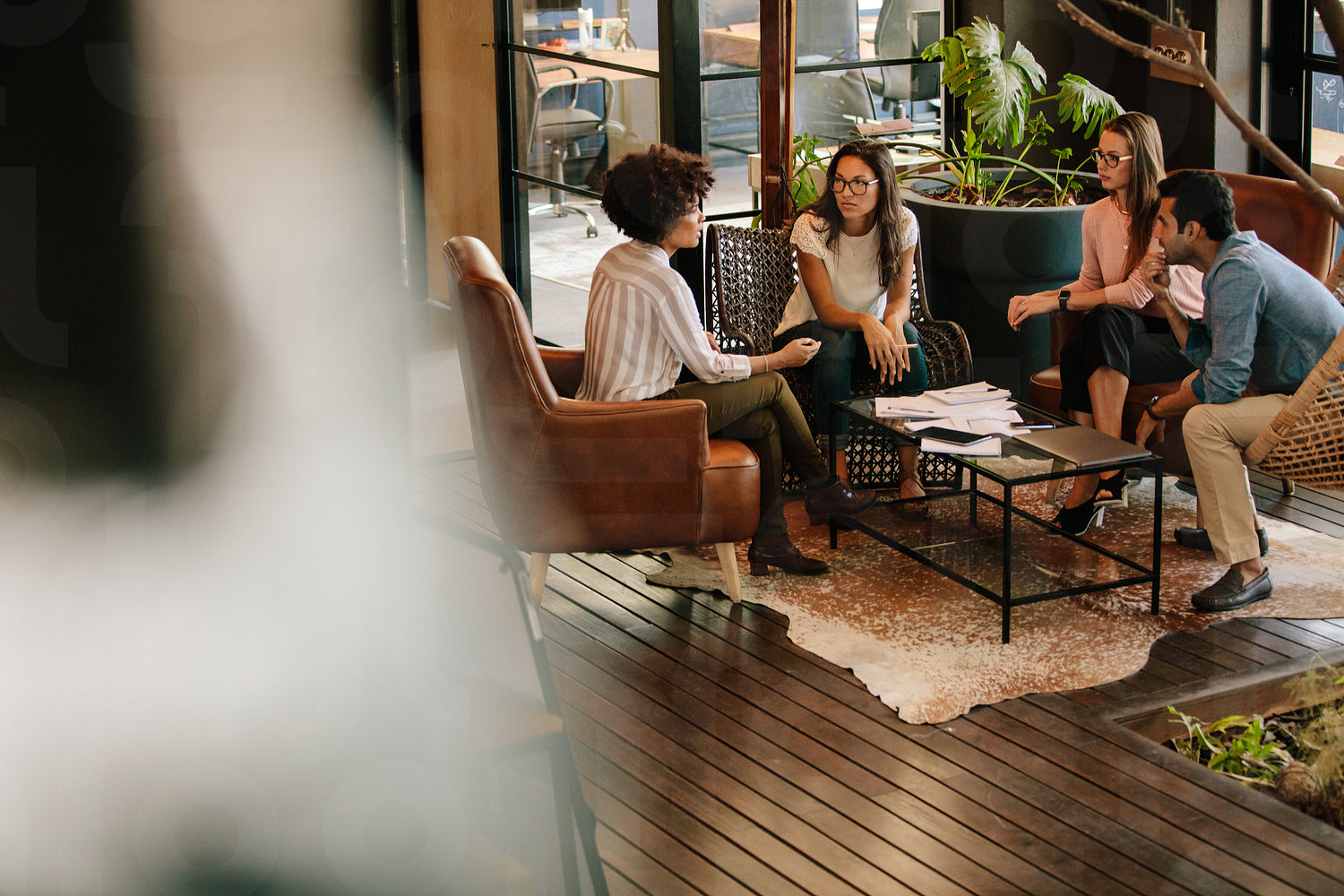Corporate professionals meeting in office lobby. Creative people doing a brainstorming meeting in a modern office
