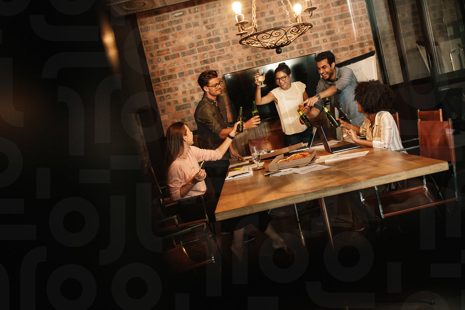 Group of successful young business professionals celebrating in office conference room. Diverse business team having food and drinks at start up office.