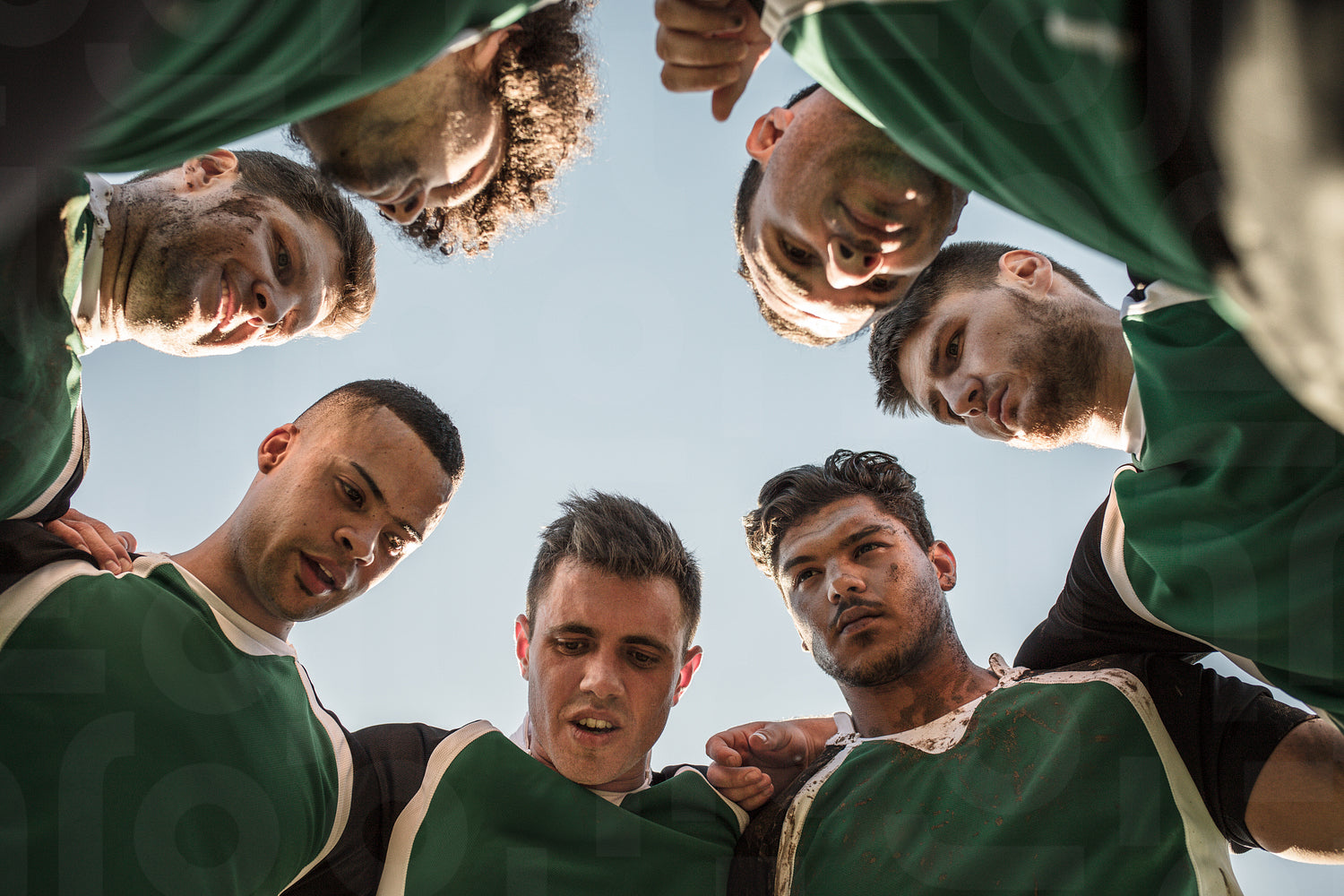 Low angle view of rugby players in circle against clear sky discussing their tactics. Team of rugby player in huddle between the match.