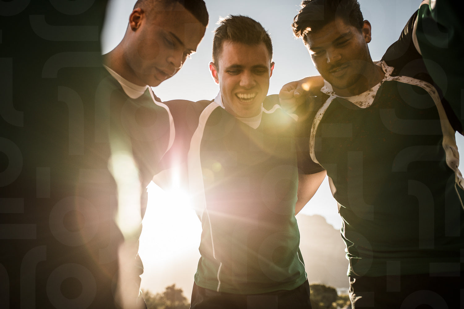 Team of rugby players standing in a huddle on bright sunny day. Group of sportsmen standing in circle after the match.