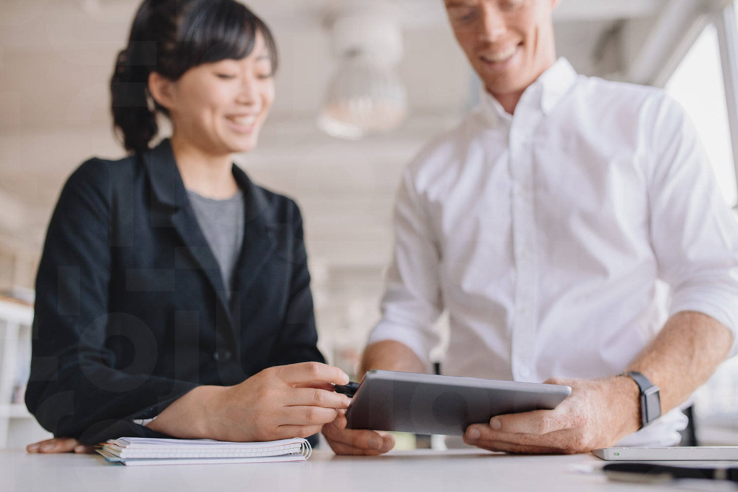 Businessman and businesswoman using touchscreen computer in office. Young business people working together, with female pointing digital tablet.
