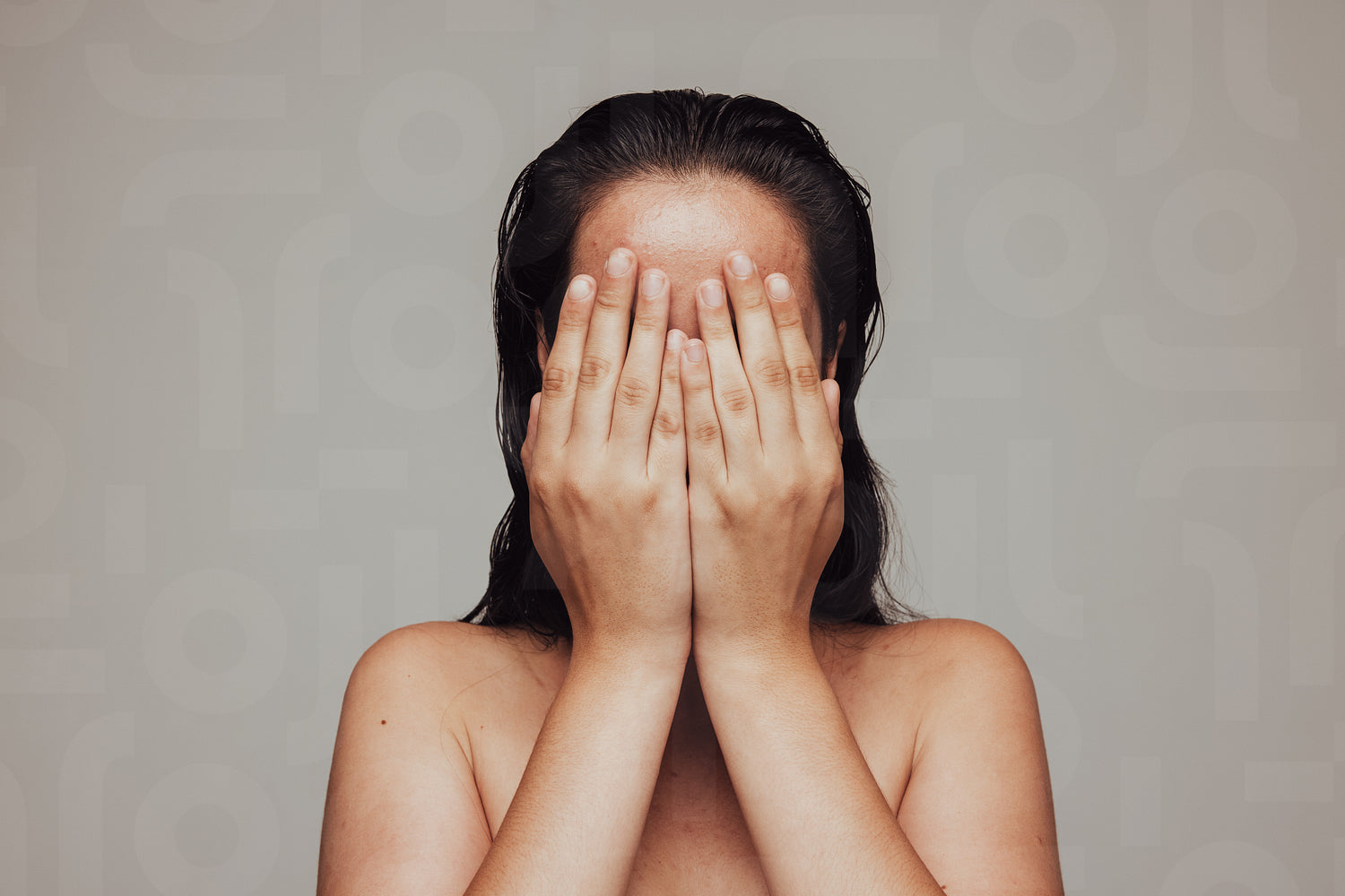 Woman with acne problem hiding her face with her hands. Woman feeling insecure due to skin imperfections.
