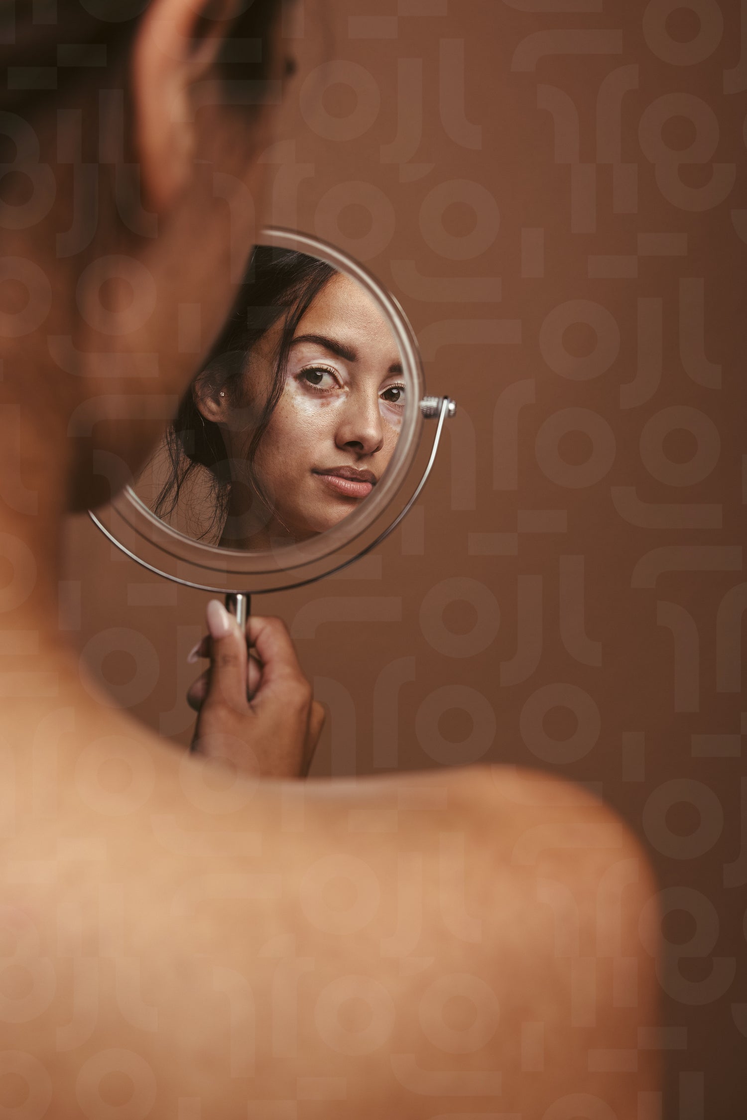 Woman with vitiligo looking at a mirror against brown background. Rear view of young woman feeling confident about her skin condition.