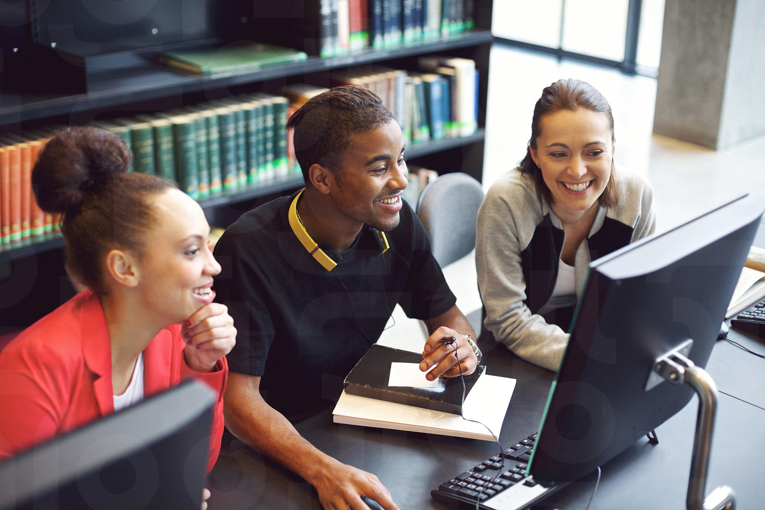 Diverse group of students using computer for finding information for their academic project. Happy young people sitting at table with books and computer taking notes for their study.