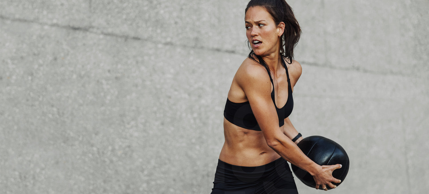 Fit woman doing workout holding a medicine ball. Woman in fitness wear doing exercise with a medicine ball.