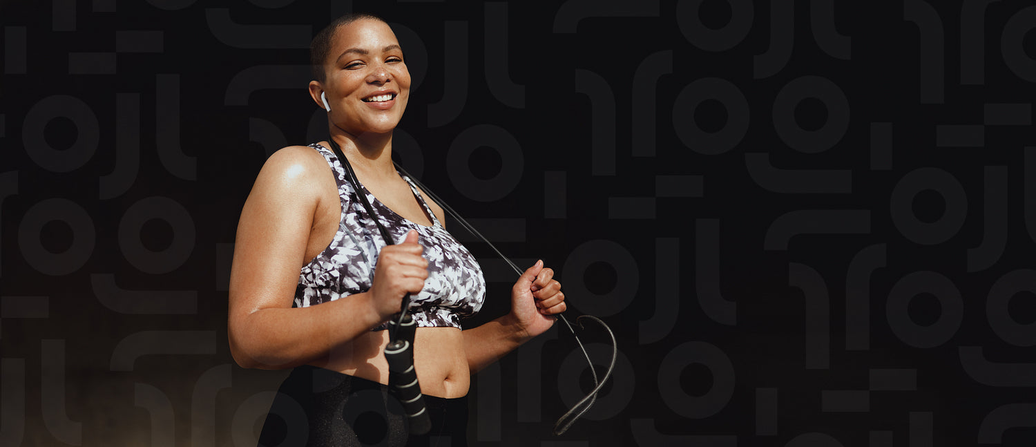 Panoramic shot of a plus size female model in sports clothing. Woman with skipping rope around her neck looking at camera and smiling.